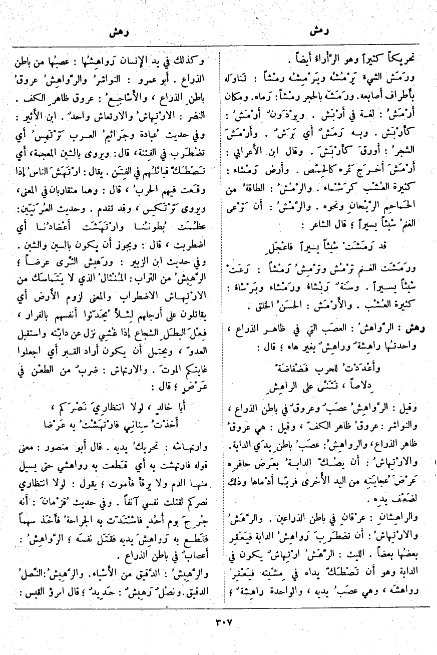 رهش: الرَّواهشُ: العصَّب الَّتِي فِي ظَاهِرِ الذِّرَاعِ، واحدتُها رَاهِشةٌ ورَاهِشٌ بِغَيْرِ هَاءٍ؛ قَالَ: