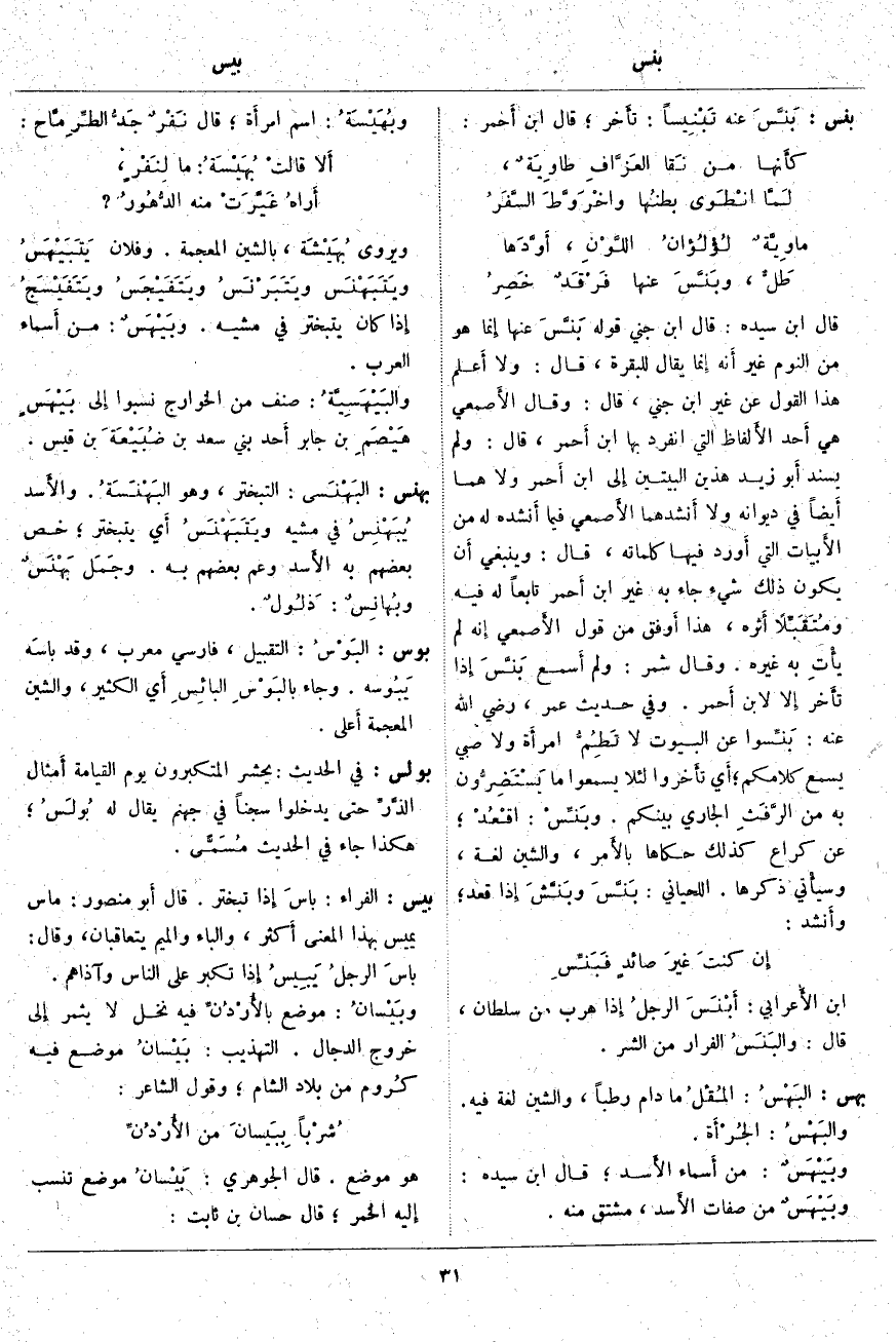بيس: الْفَرَّاءُ: باسَ إِذا تَبَخْتَرَ. قَالَ أَبو مَنْصُورٍ: مَاسَ يَمِيسُ بِهَذَا الْمَعْنَى أَكثر، وَالْبَاءُ وَالْمِيمُ يَتَعَاقَبَانِ، وَقَالَ: باسَ الرجلُ يَبِيسُ إِذا تَكَبَّرَ عَلَى النَّاسِ وَآذَاهُمْ. وبَيْسانُ: مَوْضِعٌ بالأُرْدُنِّ فِيهِ نَخْلٌ لَا يُثْمِرُ إِلى خُرُوجِ الدَّجَّالِ. التَّهْذِيبُ: بَيْسانُ مَوْضِعٌ فِيهِ كُروم مِنْ بِلَادِ الشَّامِ؛ وَقَوْلُ الشَّاعِرِ: