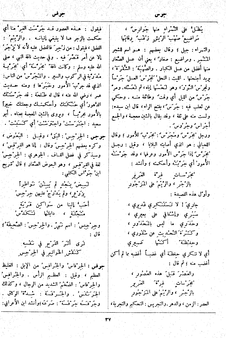 جرفس: الجِرْفاسُ والجُرافِسُ مِنَ الإِبل: الْغَلِيظُ الْعَظِيمُ، وَقِيلَ: الْعَظِيمُ الرأْس. والجُرافِسُ والجِرْفاسُ: الضَّخْمُ الشَّدِيدُ مِنَ الرِّجَالِ، وَكَذَلِكَ الجَرَنْفَسُ. والجَرْفَسَة: شِدَّةُ الوَثاق. وجَرْفَسَه جَرْفَسَةً: صَرَعَه؛ وأَنشد ابْنُ الأَعرابي: