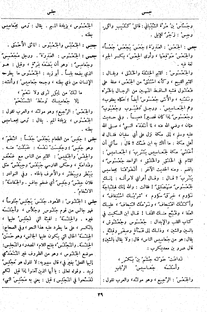 جَعْمَسَ: الجُعْمُوس: العَذِرَةُ. وَرَجُلٌ مُجَعْمِسٌ وجُعامِسٌ: وهو أَن يَضَعَه بمَرَّةٍ، وَقِيلَ: هُوَ الَّذِي يَضَعُهُ يَابِسًا. أَبو زَيْدٍ: الجُعْمُوس مَا يَطْرَحُهُ الإِنسان مِنْ ذِي بَطْنِهِ، وَجَمْعُهُ جَعامِيسُ؛ وأَنشد: