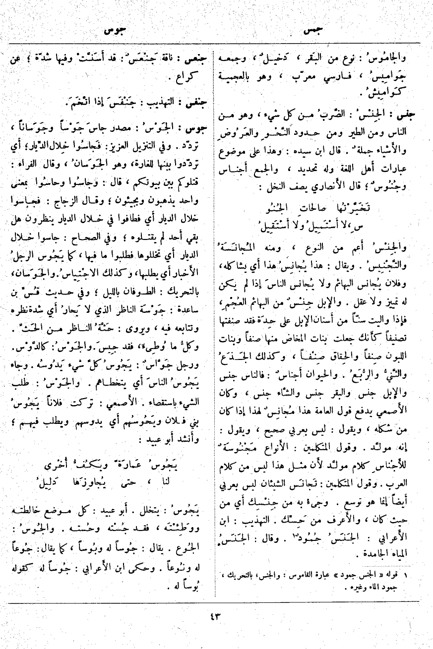 جنس: الجِنْسُ: الضَّربُ مِنْ كُلِّ شَيْءٍ، وَهُوَ مِنَ النَّاسِ وَمِنَ الطَّيْرِ وَمِنْ حُدُودِ النَحْوِ والعَرُوضِ والأَشياء جملةٌ. قَالَ ابْنُ سِيدَهْ: وَهَذَا عَلَى مَوْضُوعِ عِبَارَاتِ أَهل اللُّغَةِ وَلَهُ تَحْدِيدٌ، وَالْجَمْعُ أَجناس وجُنُوسٌ؛ قَالَ الأَنصاري يَصِفُ النَّخْلَ: