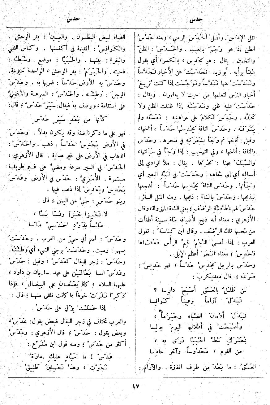 العَمْقُ: مَا بَعُدَ مِنْ طَرَفِ الْمَفَازَةِ. وَالْآرَامُ: الظِّبَاءُ الْبِيضُ الْبُطُونِ. والعِينُ: بَقَرُ الْوَحْشِ. والكَوانِسُ: الْمُقِيمَةُ فِي أَكنستها. وَكِنَاسُ الظَّبْيِ وَالْبَقَرَةِ: بَيْتُهُمَا. والحُبَيَّا: مَوْضِعٌ. وشَطُّه: نَاحِيَتُهُ. والحَيْرَمُ: بَقَرُ الْوَحْشِ، الْوَاحِدَةُ حَيرمة. وحَدَسَ بِهِ الأَرض حَدْساً: ضَرَبَهَا بِهِ. وحَدَسَ الرجلَ: وَطِئَه. والحَدْسُ: السُّرْعَةُ والمُضِيُّ عَلَى اسْتِقَامَةٍ، وَيُوصَفُ بِهِ فَيُقَالُ: سَيْرٌ حَدْسٌ؛ قَالَ: