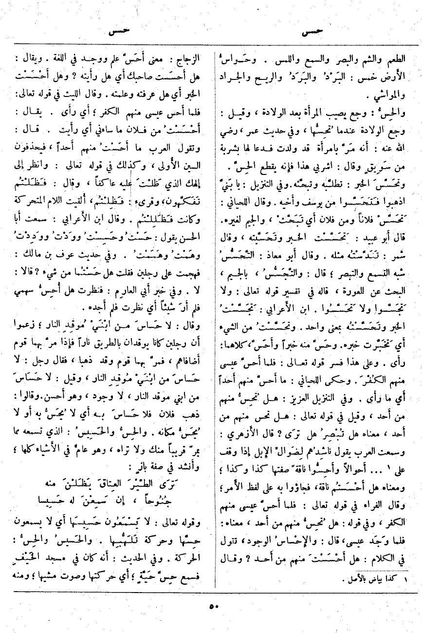 . وَقَالَ اللِّحْيَانِيُّ: تَحَسَّسْ فُلَانًا وَمِنْ فُلَانٍ أَي تَبَحَّثْ، وَالْجِيمُ لِغَيْرِهِ. قَالَ أَبو عُبَيْدٍ: تَحَسَّسْت الْخَبَرَ وتَحَسَّيته، وَقَالَ شَمِرٌ: تَنَدَّسْتُه مِثْلُهُ. وَقَالَ أَبو مُعَاذٍ: التَحَسُّسُ شِبْهُ التَّسَمُّعِ وَالتَّبَصُّرُ؛ قَالَ: والتَجَسُّسُ، بِالْجِيمِ، الْبَحْثُ عَنِ الْعَوْرَةِ، قَالَهُ فِي تَفْسِيرِ قَوْلِهِ تَعَالَى: وَلا تَجَسَّسُوا وَلَا تَحَسَّسُوا. ابْنُ الأَعرابي: تَجَسَّسْتُ الْخَبَرَ وتَحَسَّسْتُه بِمَعْنًى وَاحِدٍ. وتَحَسَّسْتُ مِنَ الشَّيْءِ أَي تَخَبَّرت خَبَرَهُ. وحَسَّ مِنْهُ خَبَرًا وأَحَسَّ، كِلَاهُمَا: رأَى. وَعَلَى هَذَا فُسِّرَ قَوْلُهُ تَعَالَى: فَلَمَّا أَحَسَّ عِيسى مِنْهُمُ الْكُفْرَ