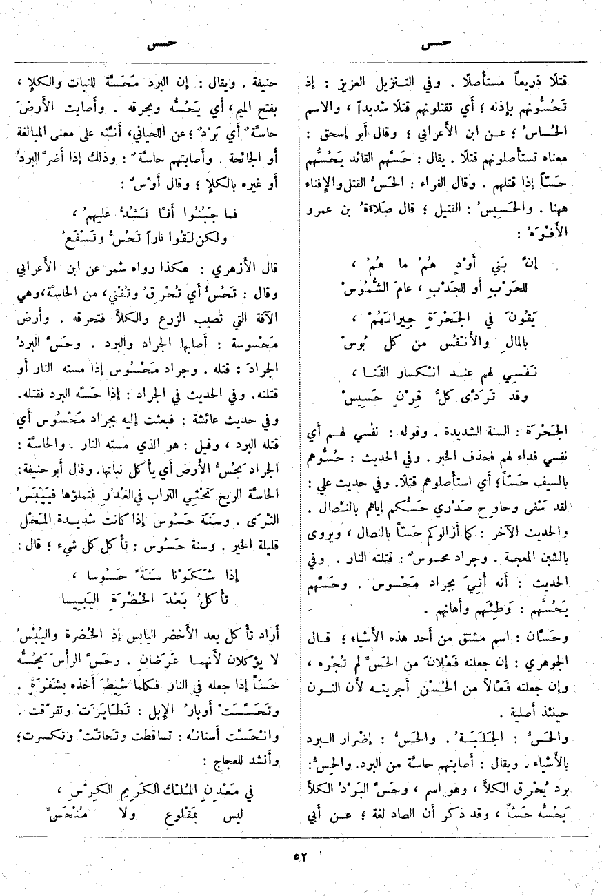 وحَسَّهم يَحُسُّهم: وَطِئَهم وأَهانهم. وحَسَّان: اسْمٌ مُشْتَقٌّ مِنْ أَحد هَذِهِ الأَشياءِ؛ قَالَ الْجَوْهَرِيُّ: إِن جَعَلْتَهُ فَعْلانَ مِنَ الحَسِّ لَمْ تُجْره، وإِن جَعَلْتَهُ فَعَّالًا مِنَ الحُسْنِ أَجريته لأَن النُّونَ حِينَئِذٍ أَصلية. والحَسُّ: الجَلَبَةُ. والحَسُّ: إِضْرار الْبَرْدِ بالأَشياء. وَيُقَالُ: أَصابتهم حاسَّة مِنَ الْبَرْدِ. والحِسُّ: بَرْدٌ يُحْرِق الكلأَ، وَهُوَ اسْمٌ، وحَسَّ البَرْدُ. والكلأَ يَحُسُّه حَسّاً، وَقَدْ ذَكَرَ أَن الصَّادَ لُغَةٌ؛ عَنْ أَبي حَنِيفَةَ. وَيُقَالُ: إِن الْبَرْدَ مَحَسَّة لِلنَّبَاتِ والكلإِ، بِفَتْحِ الْمِيمِ، أَي يَحُسُّه وَيَحْرُقُهُ. وأَصابت الأَرضَ حاسَّةٌ أَي بَرْدٌ؛ عَنِ اللِّحْيَانِيِّ، أَنَّته عَلَى مَعْنَى الْمُبَالَغَةِ أَو الْجَائِحَةِ. وأَصابتهم حاسَّةٌ: وَذَلِكَ إِذا أَضرَّ البردُ أَو غَيْرُهُ بالكلإِ؛ وَقَالَ أَوْسٌ: