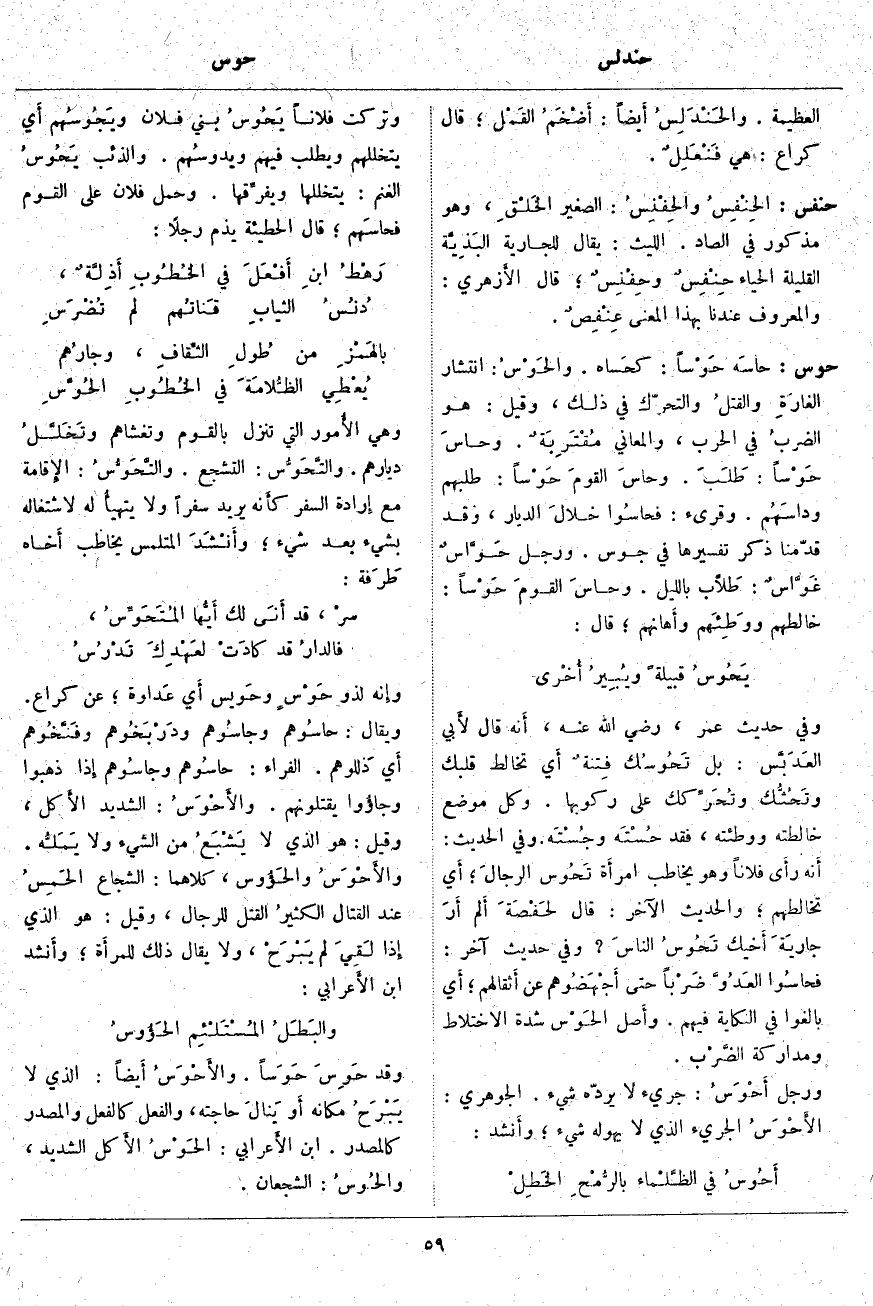 وَهِيَ الأُمور الَّتِي تَنْزِلُ بِالْقَوْمِ وَتَغْشَاهُمْ وتَخَلَّلُ دِيَارَهُمْ. والتَحَوُّس: التَّشَجُّعُ. والتَحَوُّسُ: الإِقامة مَعَ إِرادة السَّفَرِ كأَنه يُرِيدُ سَفَرًا وَلَا يتهيأُ لَهُ لِاشْتِغَالِهِ بِشَيْءٍ بَعْدَ شَيْءٍ؛ وأَنْشَدَ الْمُتَلَمِّسُ يُخَاطِبُ أَخاه طَرَفة: