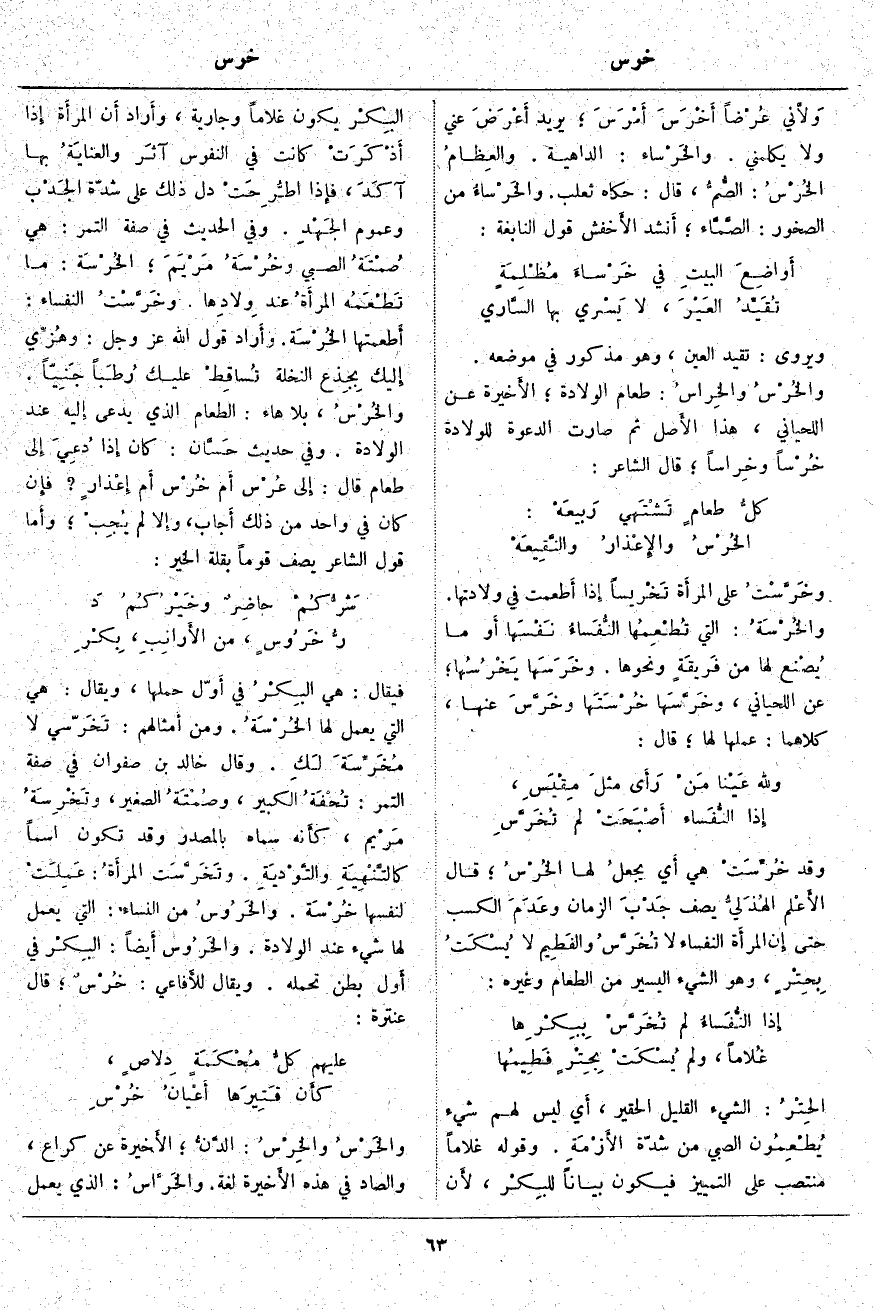 فَيُقَالُ: هِيَ البِكْرُ فِي أَوّل حَمْلِهَا، وَيُقَالُ: هِيَ الَّتِي يُعْمَلُ لَهَا الخُرْسَةُ. وَمِنْ أَمْثَالِهِمْ: تَخَرّسي لَا مُخَرِّسَةَ لَكِ. وَقَالَ خَالِدِ بْنِ صَفْوَانَ فِي صِفَةِ التَّمْرِ: تُحْفَةُ الْكَبِيرِ، وصُمْتَةُ الصَّغِيرِ، وتَخْرِسَةُ مَرْيم. كأَنه سَمَّاهُ بِالْمَصْدَرِ وَقَدْ تَكُونُ اسْمًا كالتَّنْهِيَةِ والتَّوْديَةِ. وتَخَرَّسَت المرأَةُ: عَمِلَتْ لِنَفْسِهَا خُرْسَة. والخَرُوسُ مِنَ النِّسَاءِ: الَّتِي يُعْمَلُ لَهَا شَيْءٌ عِنْدَ الْوِلَادَةِ. والخَرُوس أَيضاً: البِكْر فِي أَول بَطْنٍ تَحْمِلُهُ. وَيُقَالُ للأَفاعي: خُرْسٌ؛ قَالَ عَنْتَرَةُ: