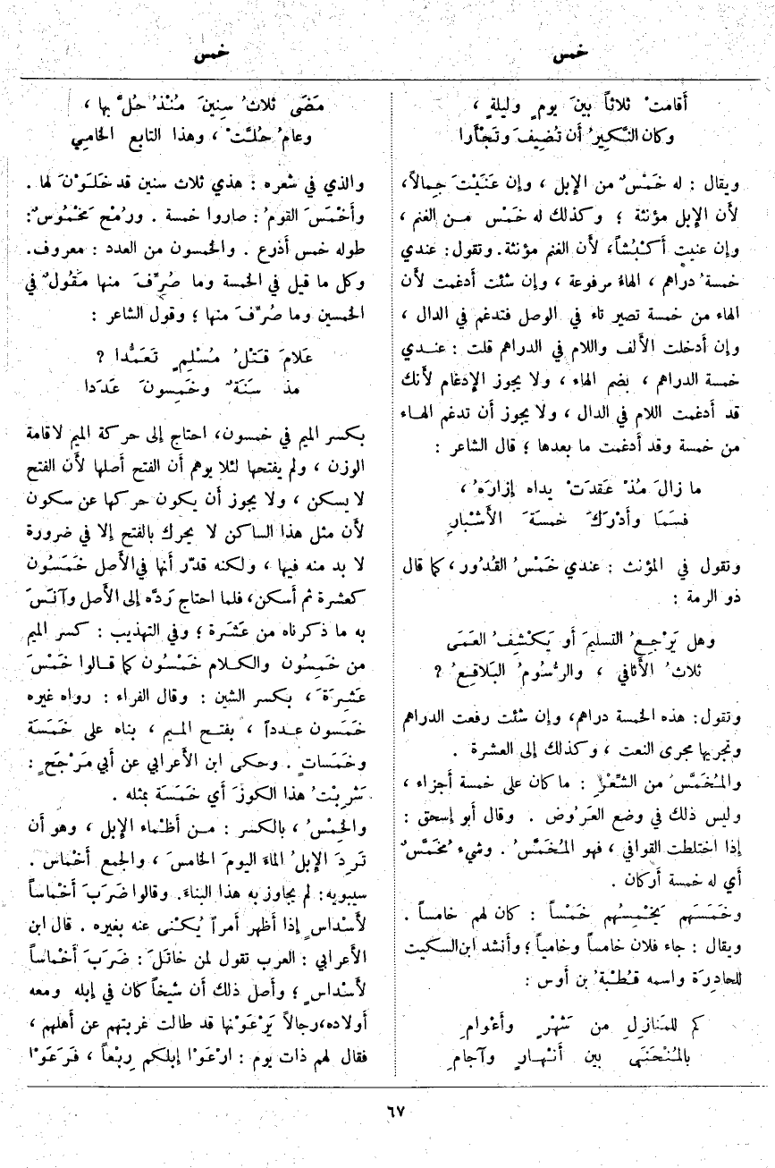 بِكَسْرِ الْمِيمِ فِي خَمِسُونَ، احْتَاجَ إِلى حَرَكَةِ الْمِيمِ لإِقامة الْوَزْنِ، وَلَمْ يَفْتَحْهَا لِئَلَّا يُوهِمَ أَن الْفَتْحَ أَصلها لأَن الْفَتْحَ لَا يُسَكَّنُ، وَلَا يَجُوزُ أَن يَكُونَ حَرَّكَهَا عَنْ سُكُونٍ لأَن مِثْلَ هَذَا السَّاكِنِ لَا يُحَرَّكُ بِالْفَتْحِ إِلا فِي ضَرُورَةٍ لَا بُدَّ مِنْهُ فِيهَا، وَلَكِنَّهُ قَدَّرَ أَنها فِي الأَصل خَمَسُون كَعَشَرَةٍ ثُمَّ أَسكن، فَلَمَّا احْتَاجَ رَدَّه إِلى الأَصل وآنَسَ بِهِ مَا ذَكَرْنَاهُ مِنْ عَشَرة؛ وَفِي التَّهْذِيبِ: كَسَرَ الْمِيمَ مِنْ خَمِسُون وَالْكَلَامُ خَمْسُون كَمَا قَالُوا خَمْسَ عَشِرَةَ، بِكَسْرِ الشِّينِ؛ وَقَالَ الْفَرَّاءُ: رَوَاهُ غَيْرُهُ خَمَسون عَدَدًا، بِفَتْحِ الْمِيمِ، بَنَاهُ عَلَى خَمَسَة وخَمَساتٍ. وَحَكَى ابْنُ الأَعرابي عَنْ أَبي مَرْجَحٍ: شَرِبْتُ هَذَا الكوزَ أَي خَمَسَة بِمِثْلِهِ. والخِمْسُ، بِالْكَسْرِ: مِنْ أَظْماء الإِبل، وَهُوَ أَن تَرِدَ الإِبلُ الماءَ اليومَ الخامسَ، وَالْجَمْعُ أَخْماس. سِيبَوَيْهِ: لَمْ يُجَاوَزُ بِهِ هَذَا البناءَ. وَقَالُوا ضَرَبَ أَخْماساً لأَسْداسِ إِذا أَظهر أَمراً يُكْنى عَنْهُ بِغَيْرِهِ. قَالَ ابْنُ الأَعرابي: الْعَرَبُ تَقُولُ لِمَنْ خاتَلَ: ضَرَبَ أَخْماساً لأَسْداسٍ؛ وأَصل ذَلِكَ أَن شَيْخًا كَانَ فِي إِبله وَمَعَهُ أَولاده، رِجَالًا يَرْعَوْنها قَدْ طَالَتْ غُرْبَتُهُمْ عَنْ أَهلهم، فَقَالَ لَهُمْ ذَاتَ يَوْمٍ: ارْعَوْا إِبلكم رِبْعاً، فَرَعَوْا