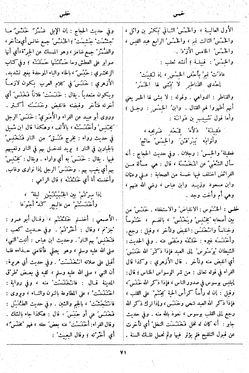 خنس: الخُنُوس: الانقباضُ وَالِاسْتِخْفَاءُ. خَنَسَ مِنْ بَيْنِ أَصحابه يَخْنِسُ ويَخْنُسُ، بِالضَّمِّ، خُنُوساً وخِناساً وانْخَنَس: انْقَبَضَ وتأَخر، وَقِيلَ: رَجَعَ. وأَخْنَسَه غَيْرُهُ: خَلَّفَه ومَضَى عَنْهُ. وَفِي الْحَدِيثِ: