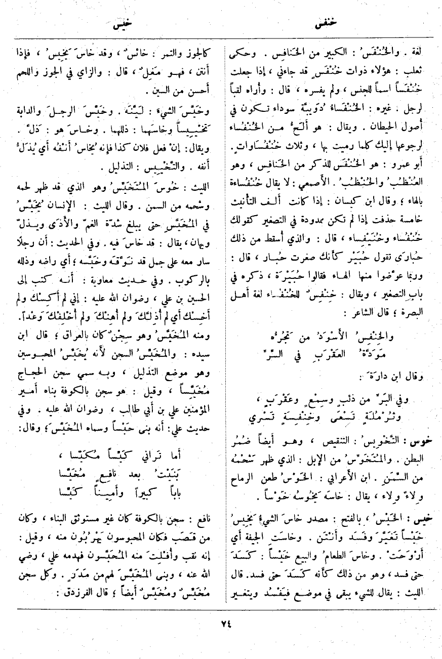 لُغَةٌ. والخُنْفَسُ: الْكَبِيرُ مِنَ الخَنافِس. وَحَكَى ثَعْلَبٌ: هَؤُلَاءِ ذَوَاتُ خُنْفَسٍ قَدْ جَاءَنِي، إِذا جَعَلْتُ خُنْفَساً اسْمًا لِلْجِنْسِ، وَلَمْ يُفَسِّرْهُ، قَالَ: وأُراه لَقَبًا لِرَجُلٍ. غَيْرُهُ: الخُنْفَساءُ دُوَيبَّة سَوْدَاءُ تَكُونُ فِي أُصول الْحِيطَانِ. وَيُقَالُ: هُوَ أَلَحُّ مِنَ الخُنْفُساء لِرُجُوعِهَا إِليك كُلَّمَا رَمَيْتَ بِهَا، وَثَلَاثُ خُنْفُسَاواتٍ. أَبو عَمْرٍو: هُوَ الخُنْفَس لِلذَّكَرِ مِنَ الخَنافِس، وَهُوَ العُنْظُبُ والحُنْظُبُ. الأَصمعي: لَا يُقَالُ خُنْفُساءة بِالْهَاءِ: وَقَالَ ابْنُ كَيْسَانَ: إِذا كَانَتْ أَلف التأْنيث خَامِسَةً حُذِفَتْ إِذا لَمْ تَكُنْ مَمْدُودَةً فِي التَّصْغِيرِ كَقَوْلِكَ خُنْفُساء وخُنَيْفِساء، قَالَ: وَالَّذِي أُسقط مِنْ ذَلِكَ حُبارى تَقُولُ حُبَيْر كأَنك صَغَّرْتَ حُبار، قَالَ: وَرُبَّمَا عوَّضوا مِنْهَا الْهَاءَ فَقَالُوا حُبَيْرَة، ذَكَرَهُ فِي بَابِ التَّصْغِيرِ، وَيُقَالُ: خِنْفِسٌ للخُنْفُساء لُغَةُ أَهل الْبَصْرَةِ؛ قال الشاعر: