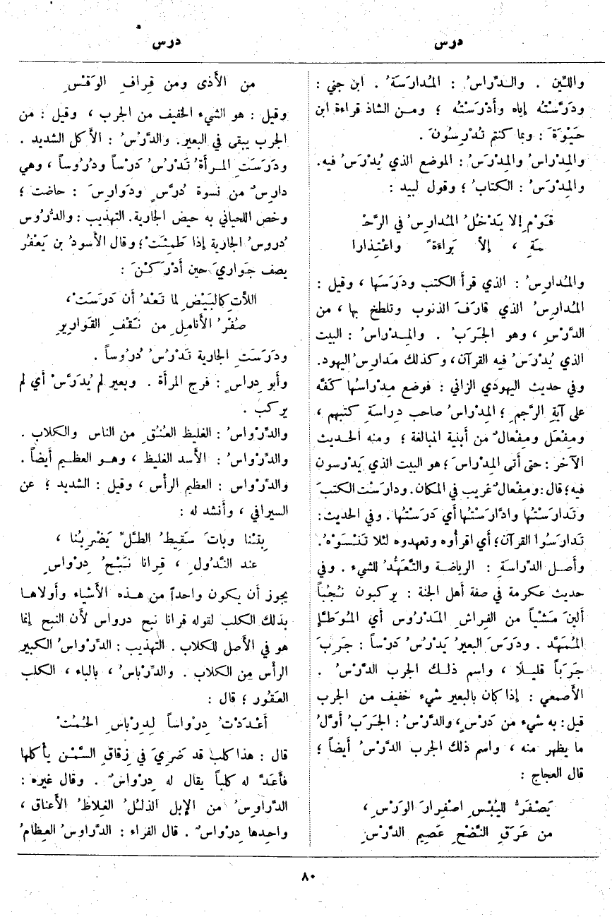 ودَرَسَتِ الْجَارِيَةُ تَدْرُسُ دُرُوساً. وأَبو دِراسٍ: فَرْجُ المرأَة. وَبَعِيرٌ لَمْ يُدَرَّسْ أَي لَمْ يُرْكَبْ. والدِّرْواسُ: الْغَلِيظُ العُنُقِ مِنَ النَّاسِ وَالْكِلَابِ. والدِّرْواسُ: الأَسد الْغَلِيظُ، وَهُوَ الْعَظِيمُ أَيضاً. والدِّرْواس: الْعَظِيمُ الرأْس، وَقِيلَ: الشَّدِيدُ؛ عَنِ السِّيرَافِيِّ، وأَنشد لَهُ: