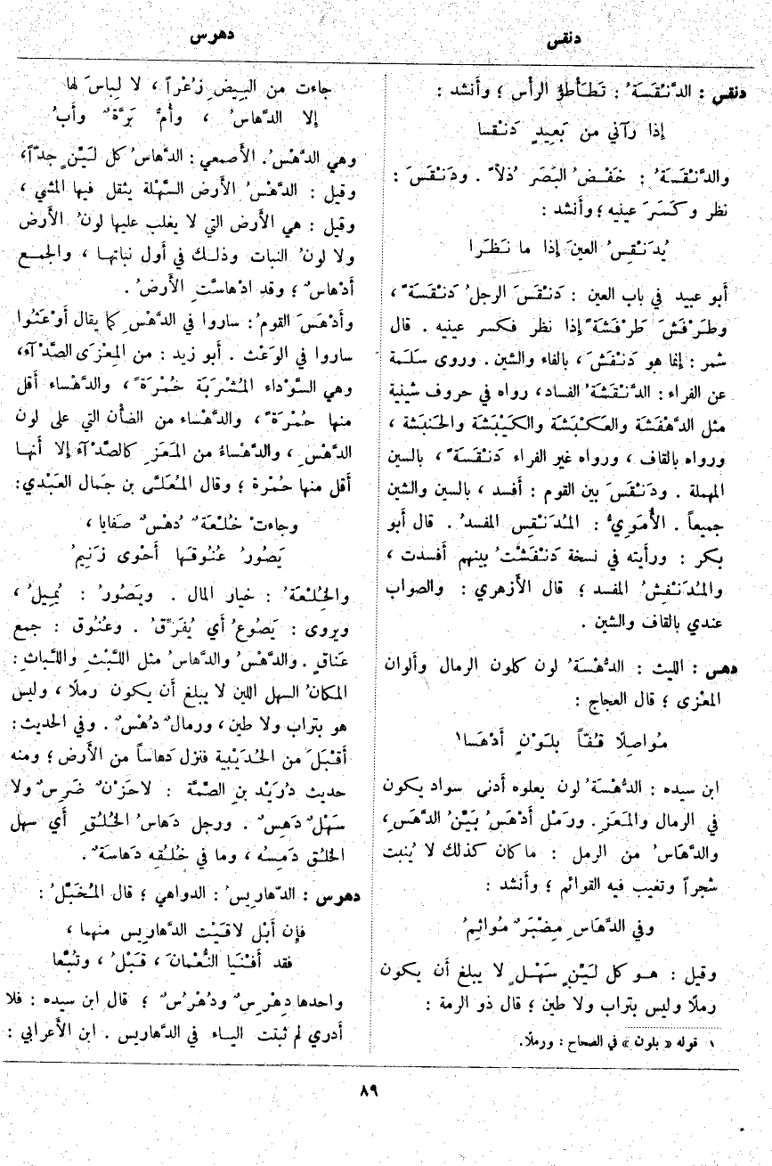 دهس: اللَّيْثُ: الدُّهْسَةُ لَوْنٌ كَلَوْنِ الرِّمَالِ وأَلوان المعْزى؛ قَالَ الْعَجَّاجُ: