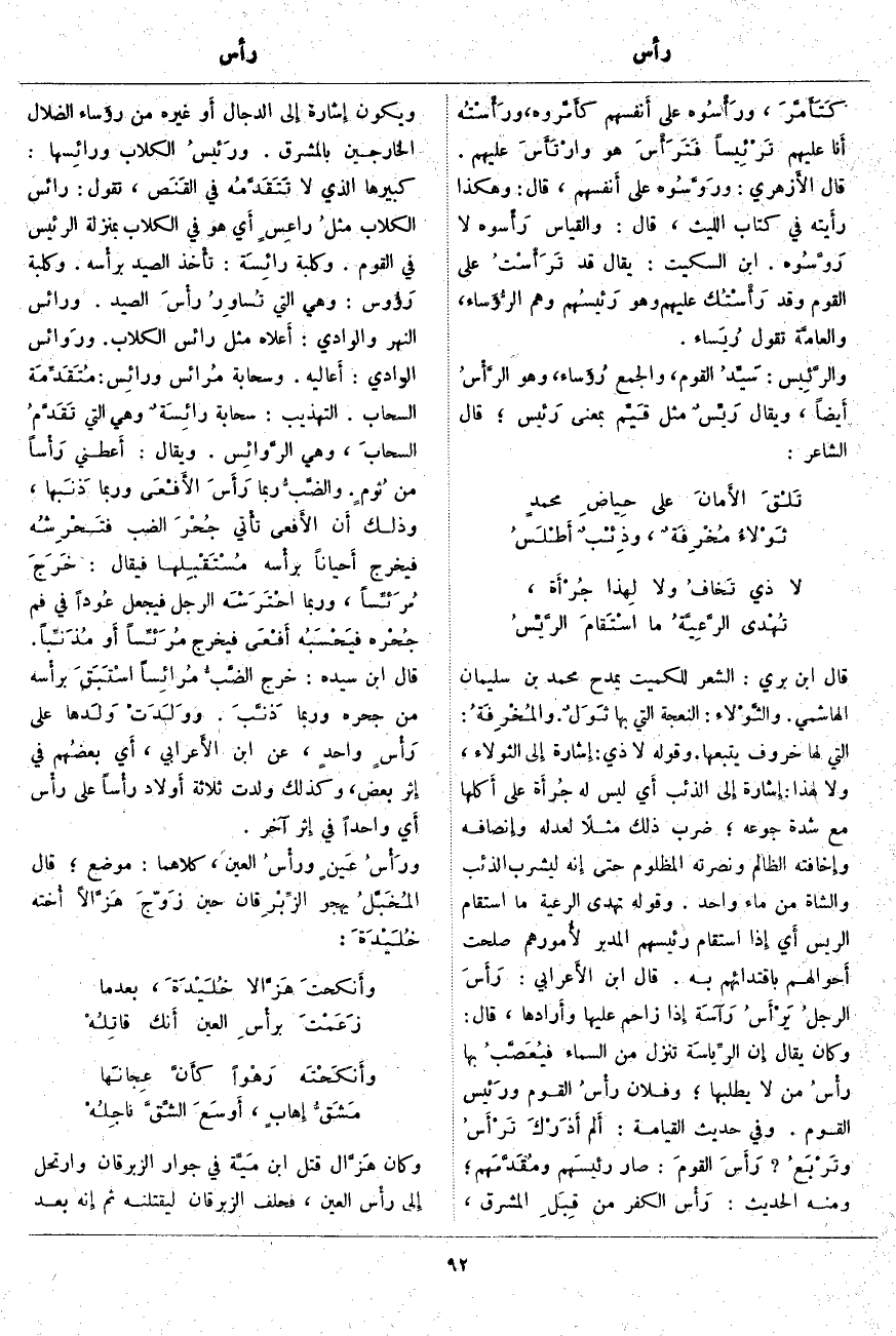 ، وَيَكُونُ إِشارة إِلى الدَّجَّالِ أَو غَيْرِهِ مِنْ رؤَساء الضَّلَالِ الْخَارِجِينَ بِالْمَشْرِقِ. ورَئيسُ الْكِلَابِ ورائِسها: كَبِيرُهَا الَّذِي لَا تَتَقَدَّمُه فِي القَنَص، تَقُولُ: رَائِسُ الْكِلَابِ مثلُ راعِسٍ أَي هُوَ فِي الْكِلَابِ بِمَنْزِلَةِ الرَّئِيسِ فِي الْقَوْمِ. وَكَلْبَةٌ رائِسَة: تأْخذ الصَّيْدَ برأْسه. وكلبة رَؤوس: وَهِيَ الَّتِي تُساوِرُ رأْسَ الصَّيْدِ. وَرَائِسُ النَّهْرِ وَالْوَادِي: أَعلاه مِثْلُ رَائِسِ الْكِلَابِ. ورَوائس الْوَادِي: أَعاليه. وَسَحَابَةٌ مُرائس ورائِس: مُتَقَدِّمَة السَّحَابِ. التَّهْذِيبُ: سَحَابَةٌ رائِسَةٌ وَهِيَ الَّتِي تَقَدَّمُ السحابَ، وَهِيَ الرَّوائِس. وَيُقَالُ: أَعطني رَأْساً مِنْ ثُومٍ. والضَّبُّ رُبَّمَا رَأَسَ الأَفْعَى وَرُبَّمَا ذَنَبها، وَذَلِكَ أَن الأَفعى تأْتي جُحْرَ الضَّبِّ فتَحْرِشُه فَيَخْرُجُ أَحياناً برأْسه مُسْتَقْبِلها فَيُقَالُ: خَرَجَ مُرَئِّساً، وَرُبَّمَا احْتَرَشَه الرَّجُلُ فَيَجْعَلُ عُوداً فِي فَمِ جُحْره فيَحْسَبُه أَفْعَى فَيَخْرُجُ مُرَئِّساً أَو مُذَنِّباً. قَالَ ابْنُ سِيدَهْ: خَرَجَ الضَّبُّ مُرائِساً اسْتَبَقَ برأْسه مِنْ جُحْرِهِ وَرُبَّمَا ذَنَّبَ. ووَلَدَتْ وَلَدها عَلَى رَأْسٍ واحدٍ، عَنِ ابْنِ الأَعرابي، أَي بعضُهم فِي إِثر بَعْضٍ، وَكَذَلِكَ وَلَدَتْ ثَلَاثَةَ أَولاد رأْساً عَلَى رأْس أَي وَاحِدًا فِي إِثر آخَرَ. ورَأْسُ عَينٍ ورأْسُ الْعَيْنِ، كِلَاهُمَا: مَوْضِعٌ؛ قَالَ المُخَبَّلُ يَهْجُو الزِّبْرِقان حِينَ زَوّجَ هَزَّالًا أُخته خُلَيْدَةَ: