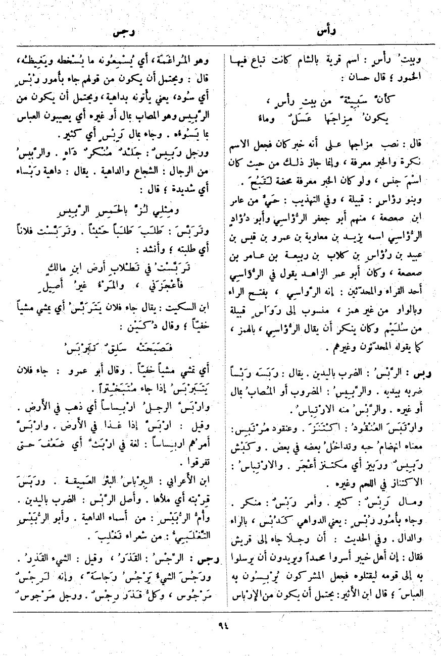 قَالَ: نُصِبَ مِزَاجُهَا عَلَى أَنه خَبَرُ كَانَ فَجُعِلَ الِاسْمُ نَكِرَةً وَالْخَبَرُ مَعْرِفَةً، وإِنما جَازَ ذَلِكَ مِنْ حَيْثُ كَانَ اسْمَ جِنْسٍ، وَلَوْ كَانَ الْخَبَرُ مَعْرِفَةً مَحْضَةً لَقَبُحَ. وَبَنُو رؤاسٍ: قَبِيلَةٌ، وَفِي التَّهْذِيبِ: حَيٌّ مِنَ عَامِرِ بْنِ صَعْصَعَةَ، مِنْهُمُ أَبو جَعْفَرٍ الرُّؤاسِي وأَبو دُؤادٍ الرُّؤاسِي اسْمُهُ يَزِيدُ بْنِ مُعَاوِيَةَ بْنُ عَمْرِو بْنِ قَيْسِ بْنِ عُبَيْدِ بْنِ رُؤاسِ بْنِ كِلَابِ بْنِ رَبِيعَةَ بْنِ عَامِرِ بْنِ صَعْصَعَةَ، وَكَانَ أَبو عُمَرَ الزَّاهِدُ يَقُولُ فِي الرُّؤاسِي أَحد الْقُرَّاءِ وَالْمُحَدِّثِينَ: إِنه الرَّواسِي، بِفَتْحِ الرَّاءِ وَبِالْوَاوِ مِنْ غَيْرِ هَمْزٍ، مَنْسُوبٌ إِلى رَوَاسٍ قَبِيلَةٍ مِنْ سُلَيْم وَكَانَ يُنْكِرُ أَن يُقَالَ الرُّؤاسِي، بِالْهَمْزِ، كَمَا يَقُولُهُ الْمُحَدِّثُونَ وغيرهم.