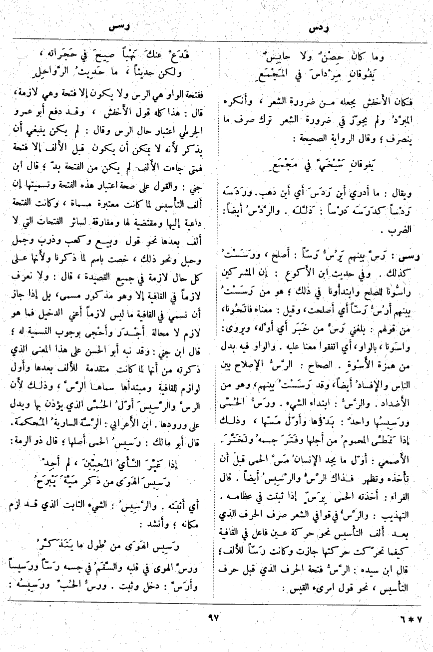 فَفَتْحَةُ الْوَاوِ هِيَ الرَّسِّ وَلَا يَكُونُ إِلا فَتْحَةً وَهِيَ لَازِمَةٌ، قَالَ: هَذَا كُلُّهُ قَوْلُ الأَخفش، وَقَدْ دَفَعَ أَبو عَمْرٍو الْجَرْمِيُّ اعْتِبَارَ حَالِ الرَّسِّ وَقَالَ: لَمْ يَكُنْ يَنْبَغِي أَن يُذْكَرَ لأَنه لَا يُمْكِنُ أَن يَكُونَ قَبْلَ الأَلف إِلا فَتْحَةٌ فَمَتَى جَاءَتِ الأَلف لَمْ يَكُنْ مِنَ الْفَتْحَةِ بُدٌّ؛ قَالَ ابْنُ جِنِّي: وَالْقَوْلُ عَلَى صِحَّةِ اعْتِبَارِ هَذِهِ الْفَتْحَةِ وَتَسْمِيَتِهَا إِن أَلف التأْسيس لَمَّا كَانَتْ مُعْتَبَرَةً مُسَمَّاةً، وَكَانَتِ الْفَتْحَةُ دَاعِيَةً إِليها وَمُقْتَضِيَةً لَهَا وَمُفَارِقَةً لِسَائِرِ الْفَتَحَاتِ الَّتِي لَا أَلف بَعْدَهَا نَحْوَ قَوْلٍ وَبَيْعٍ وَكَعْبٍ وَذَرْبٍ وَجَمْلٍ وَحَبْلٍ وَنَحْوِ ذَلِكَ، خُصَّتْ بِاسْمٍ لِمَا ذَكَرْنَا ولأَنها عَلَى كُلِّ حَالٍ لَازِمَةٌ فِي جَمِيعِ الْقَصِيدَةِ، قَالَ: وَلَا نَعْرِفُ لَازِمًا فِي الْقَافِيَةِ إِلا وَهُوَ مَذْكُورٌ مُسَمًّى، بَلْ إِذا جَازَ أَن نُسَمِّيَ فِي الْقَافِيَةِ مَا لَيْسَ لَازِمًا أَعني الدَّخِيلَ فَمَا هُوَ لَازِمٌ لَا مَحَالَةَ أَجْدَر وأَحْجى بِوُجُوبِ التَّسْمِيَةِ لَهُ؛ قَالَ ابْنُ جِنِّي: وَقَدْ نَبَّهَ أَبو الْحَسَنِ عَلَى هَذَا الْمَعْنَى الَّذِي ذَكَرْتُهُ مِنْ أَنها لَمَّا كَانَتْ مُتَقَدِّمَةً للأَلف بَعْدَهَا وأَول لَوَازِمٍ لِلْقَافِيَةِ وَمُبْتَدَأَهَا سَمَّاهَا الرَّسَّ، وَذَلِكَ لأَن الرسَّ والرَّسِيسَ أَوّلُ الحُمَّى الَّذِي يُؤْذِنُ بِهَا وَيَدُلُّ عَلَى وُرُودِهَا. ابْنُ الأَعرابي: الرَّسَّة الساريةُ المُحكمَة. قَالَ أَبو مَالِكٍ: رَسِيسُ الْحُمَّى أَصلها؛ قَالَ ذُو الرُّمَّةِ: