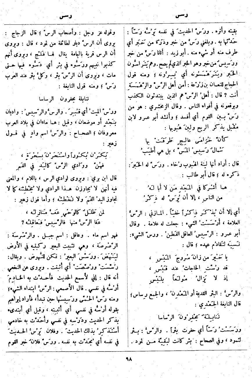 ورَسَسْتُ رَسّاً أَي حَفَرْتُ بِئْرًا. والرَّسُّ: بِئْرٌ لِثَمُودَ، وَفِي الصِّحَاحِ: بِئْرٌ كَانَتْ لبَقِيَّة مِنْ ثَمُودَ. وَقَوْلُهُ عَزَّ وَجَلَّ: وَأَصْحابَ الرَّسِّ*