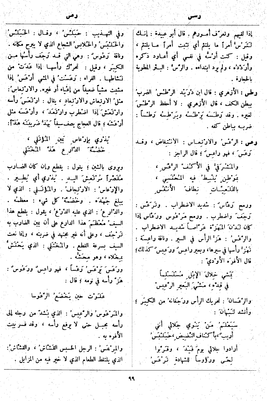 رعس: الرَّعْسُ والارْتِعاس: الانْتِفاض، وَقَدْ رَعَسَ، فَهُوَ راعِسٌ؛ قَالَ الرَّاجِزُ: