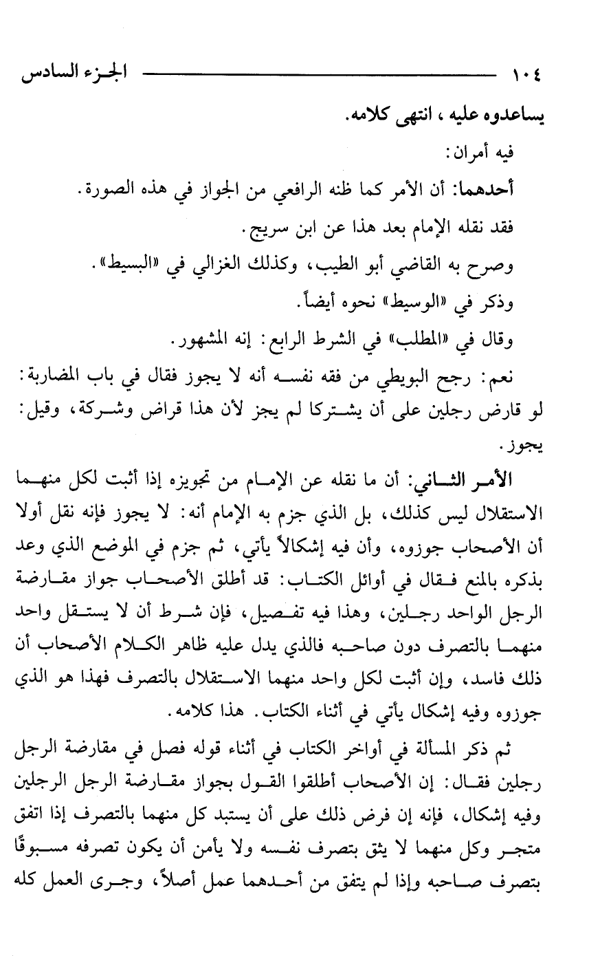 الأمر الثاني: أن ما نقله عن الإمام من تجويزه إذا أثبت لكل منهما الاستقلال ليس كذلك، بل الذي جزم به الإمام أنه: لا يجوز فإنه نقل أولًا أن الأصحاب جوزوه، وأن فيه إشكالًا يأتي، ثم جزم في الموضع الذي وعد بذكره بالمنع فقال في أوائل الكتاب: قد أطلق الأصحاب جواز مقارضة الرجل الواحد رجلين، وهذا فيه تفصيل، فإن شرط أن لا يستقل واحد منهما بالتصرف دون صاحبه فالذي يدل عليه ظاهر الكلام الأصحاب أن ذلك فاسد، وإن أثبت لكل واحد منهما الاستقلال بالتصرف فهذا هو الذي جوزوه وفيه إشكال يأتي في أثناء الكتاب. هذا كلامه.