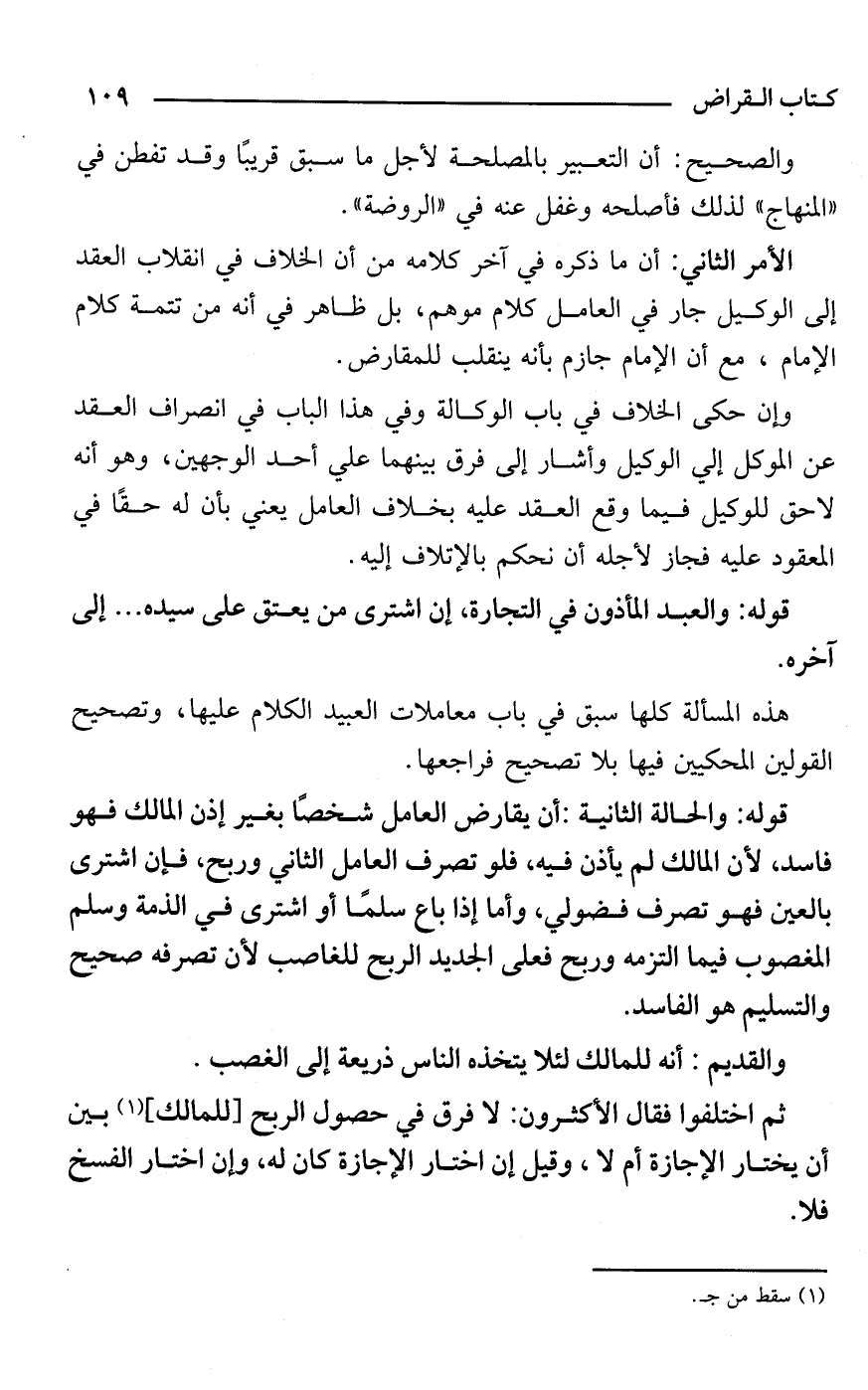 الأمر الثاني: أن ما ذكره في آخر كلامه من أن الخلاف في انقلاب العقد إلى الوكيل جار في العامل كلام موهم، بل ظاهر في أنه من تتمة كلام الإمام، مع أن الإمام جازم بأنه ينقلب للمقارض.