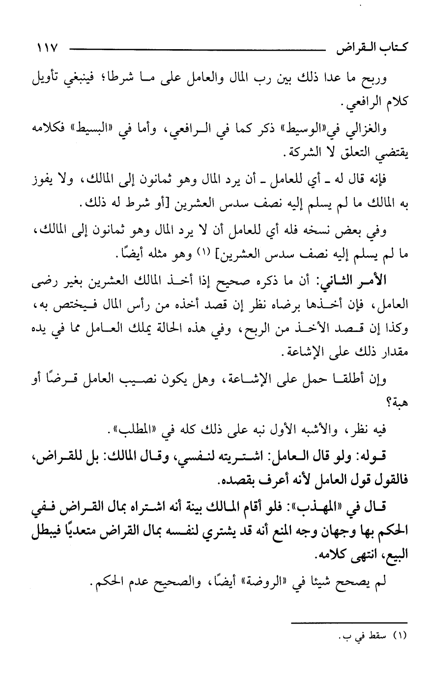 فإنه قال له -أي للعامل- أن يرد المال وهو ثمانون إلى المالك، ولا يفوز به المالك ما لم يسلم إليه نصف سدس العشرين [أو شرط له ذلك.