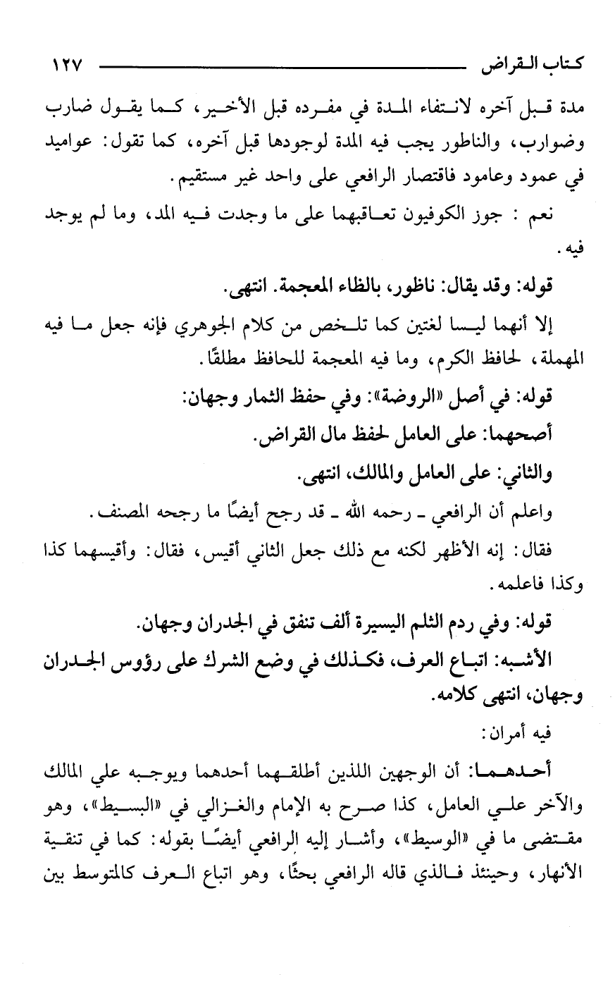 أحدهما: أن الوجهين اللذين أطلقهما أحدهما ويوجبه علي المالك والآخر علي العامل، كذا صرح به الإمام والغزالي في "البسيط"، وهو مقتضى ما في "الوسيط"، وأشار إليه الرافعي أيضًا بقوله: كما في تنقية الأنهار، وحينئذ فالذي قاله الرافعي بحثًا، وهو اتباع العرف كالمتوسط بين