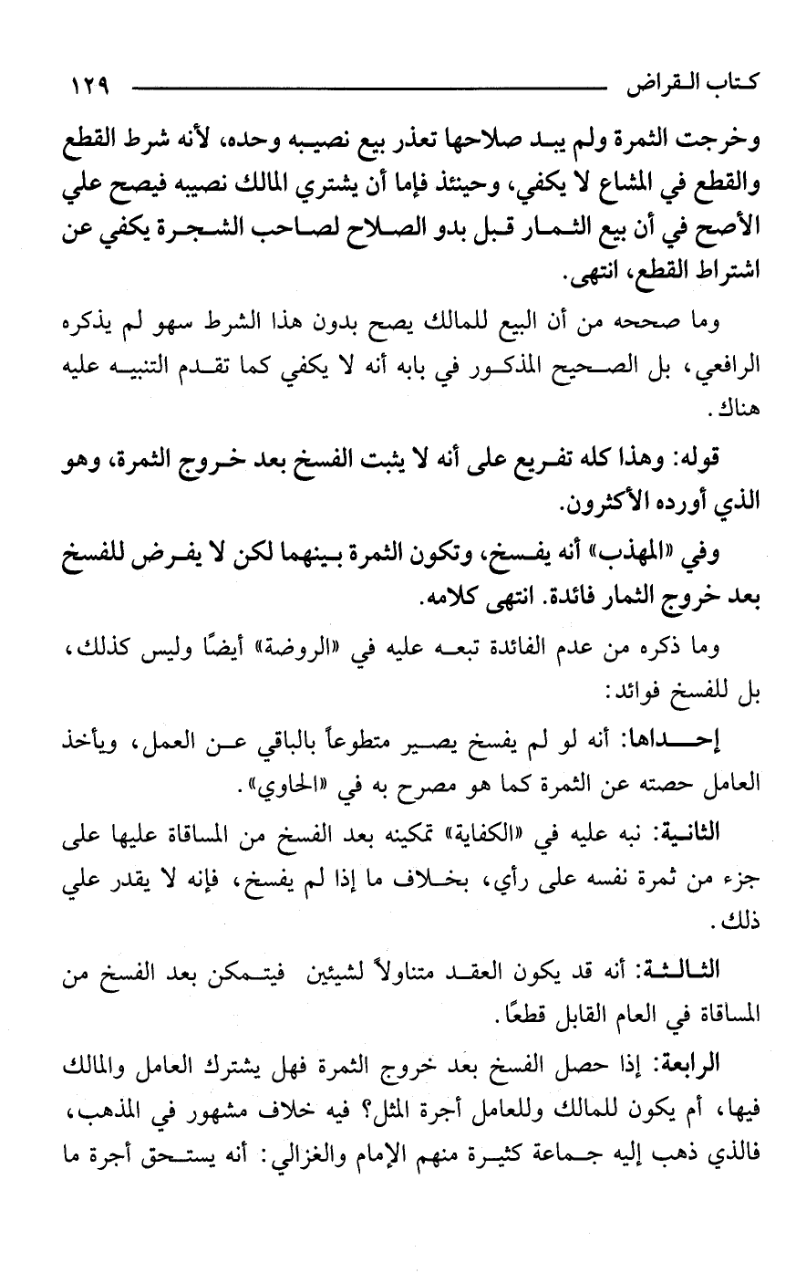 الرابعة: إذا حصل الفسخ بعد خروج الثمرة فهل يشترك العامل والمالك فيها، أم يكون للمالك وللعامل أجرة المثل؟ فيه خلاف مشهور في المذهب، فالذي ذهب إليه جماعة كثيرة منهم الإمام والغزالي: أنه يستحق أجرة ما