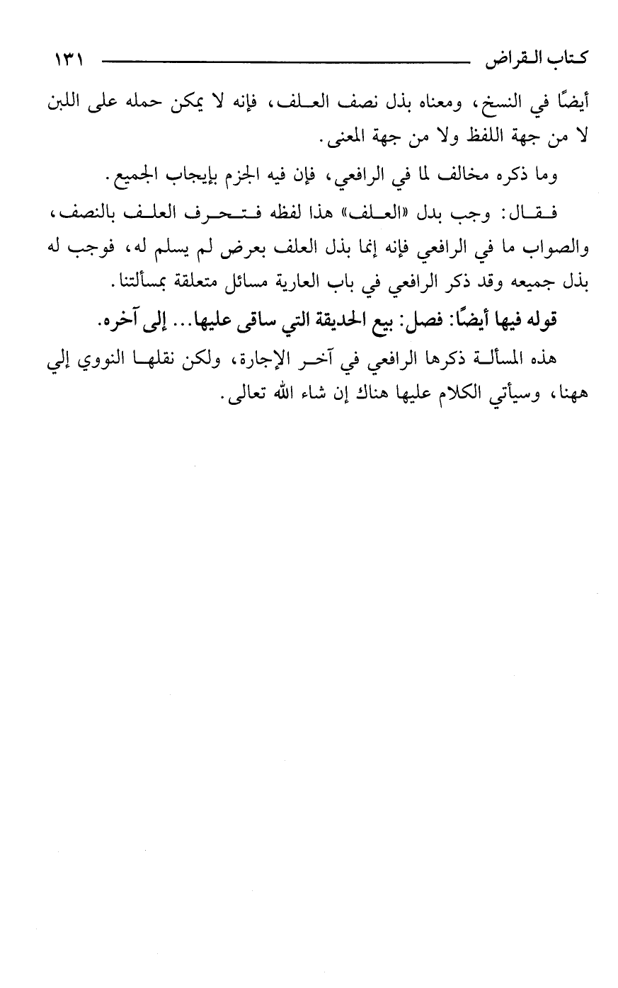 فقال: وجب بدل "العلف" هذا لفظه فتحرف العلف بالنصف، والصواب ما في الرافعي فإنه إنما بذل العلف بعرض لم يسلم له، فوجب له بذل جميعه وقد ذكر الرافعي في باب العارية مسائل متعلقة بمسألتنا.
