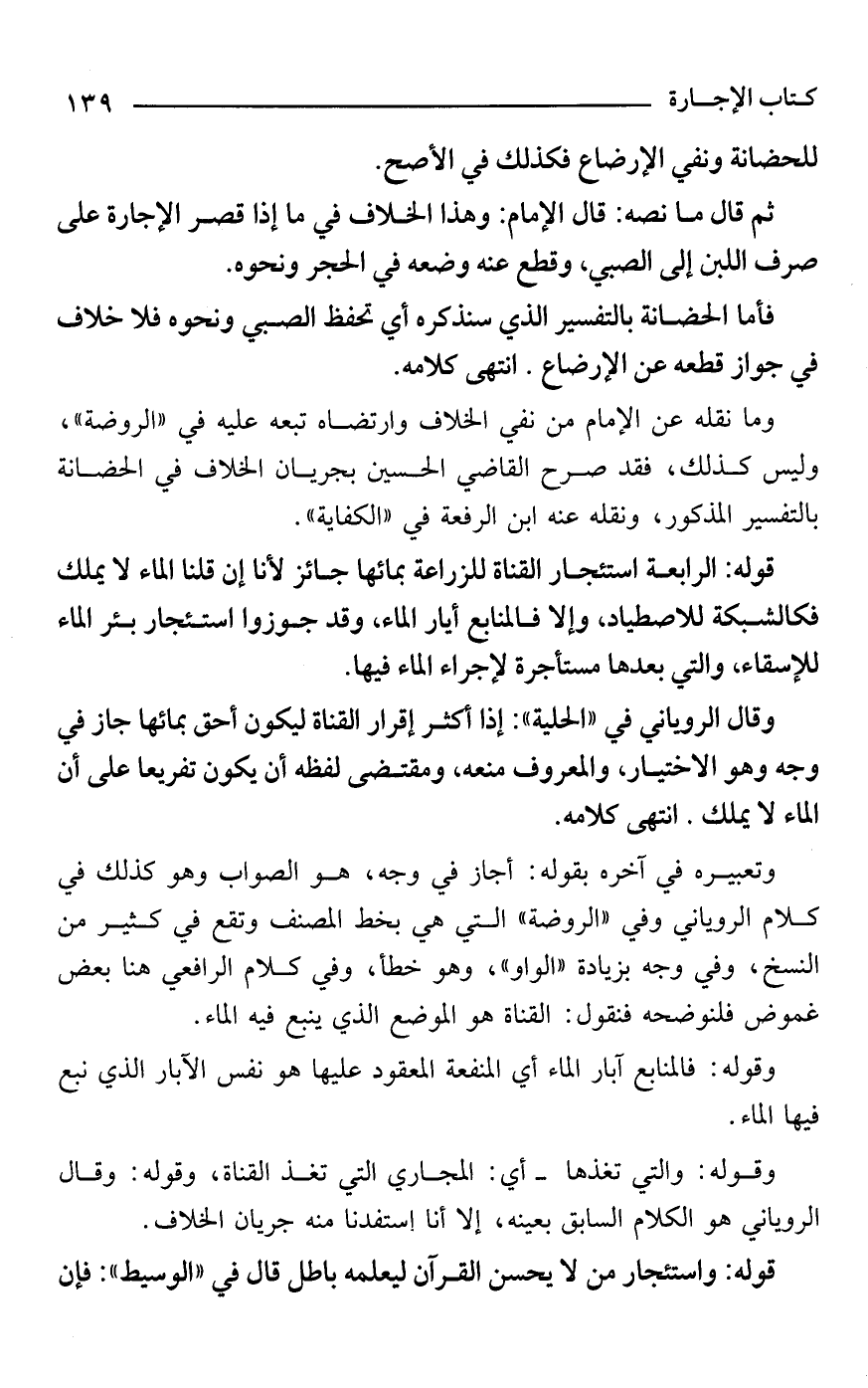 قوله: الرابعة استئجار القناة للزراعة بمائها جائز لأنا إن قلنا الماء لا يملك فكالشبكة للاصطياد، وإلا فالمنابع آبار الماء، وقد جوزوا استئجار بئر الماء للإسقاء، والتي بعدها مستأجرة لإجراء الماء فيها.