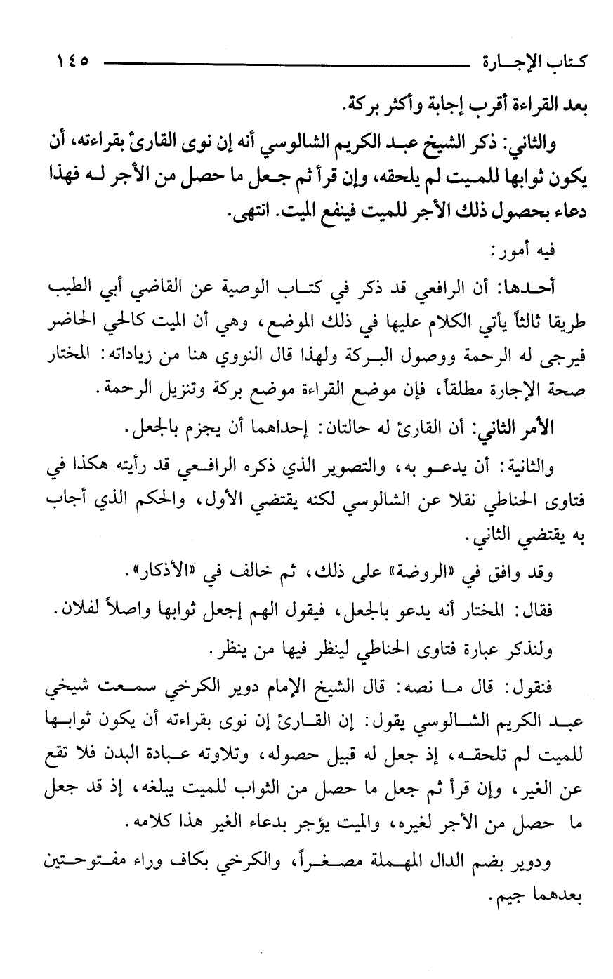 فنقول: قال ما نصه: قال الشيخ الإمام دوير الكرخي سمعت شيخي عبد الكريم الشالوسي يقول: إن القارئ إن نوى بقراءته أن يكون ثوابها للميت لم تلحقه، إذ جعل له قبيل حصوله، وتلاوته عبادة البدن فلا تقع عن الغير، وإن قرأ ثم جعل ما حصل من الثواب للميت يبلغه، إذ قد جعل ما حصل من الأجر لغيره، والميت يؤجر بدعاء الغير هذا كلامه.