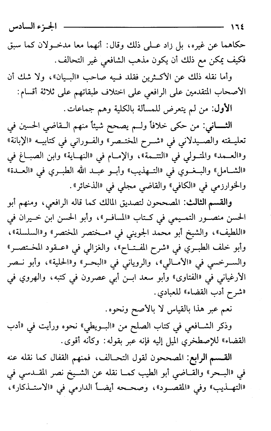 القسم الرابع: المصححون لقول التحالف، فمنهم القفال كما نقله عنه في "البحر" والقاضي أبو الطيب كما نقله عن الشيخ نصر المقدسي في "التهذيب" وفي "المقصود"، وصححه أيضًا الدارمي في "الاستذكار"،