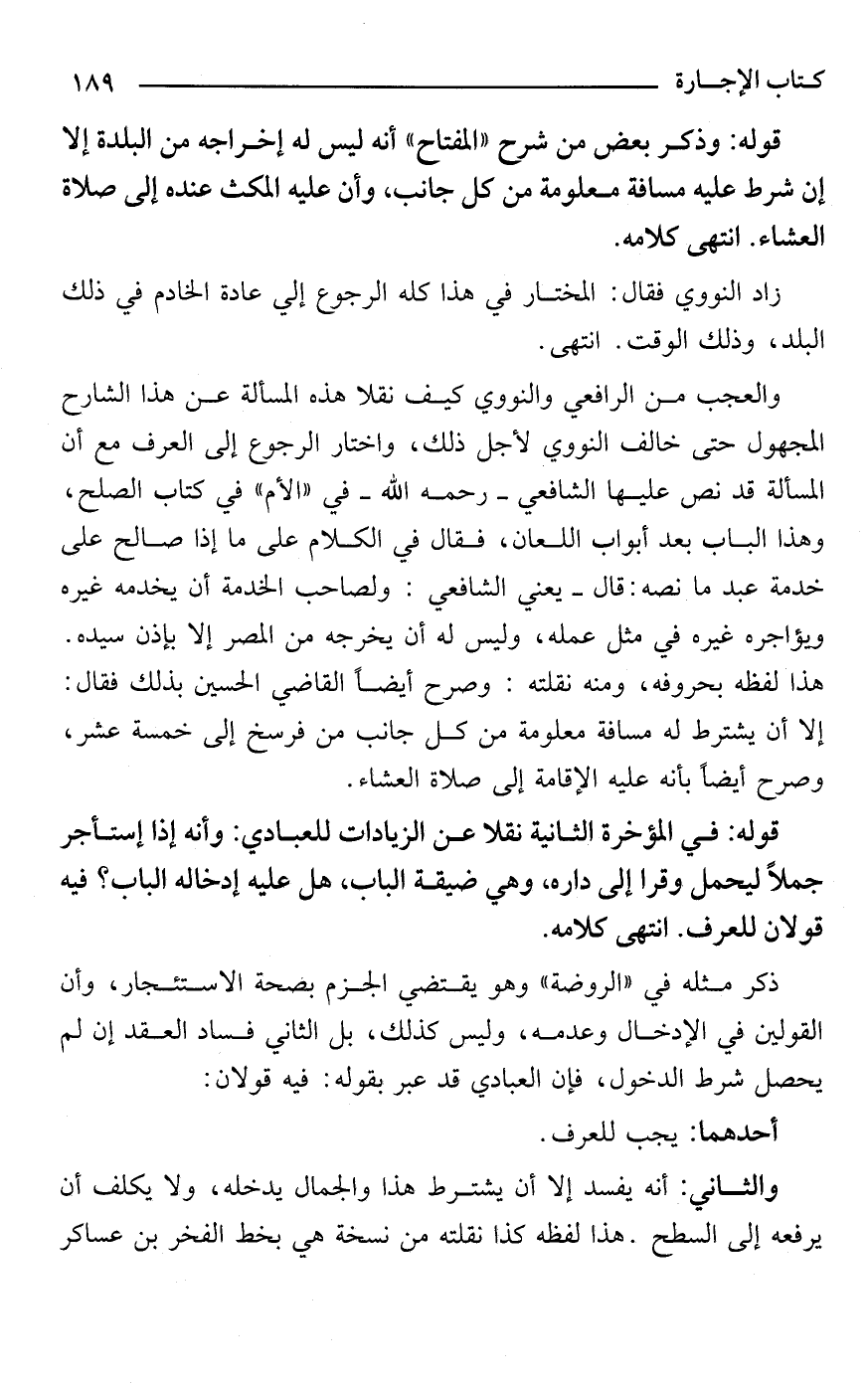والعجب من الرافعي والنووي كيف نقلا هذه المسألة عن هذا الشارح المجهول حتى خالف النووي لأجل ذلك، واختار الرجوع إلى العرف مع أن المسألة قد نص عليها الشافعي -رحمه الله- في "الأم" في كتاب الصلح، وهذا الباب بعد أبواب اللعان، فقال في الكلام على ما إذا صالح على خدمة عبد ما نصه: قال -يعني الشافعي: ولصاحب الخدمة أن يخدمه غيره ويؤاجره غيره في مثل عمله، وليس له أن يخرجه من المصر إلا بإذن سيده. هذا لفظه بحروفه، ومنه نقلته: وصرح أيضًا القاضي الحسين بذلك فقال: إلا أن يشترط له مسافة معلومة من كل جانب من فرسخ إلى خمسة عشر، وصرح أيضًا بأنه عليه الإقامة إلى صلاة العشاء.