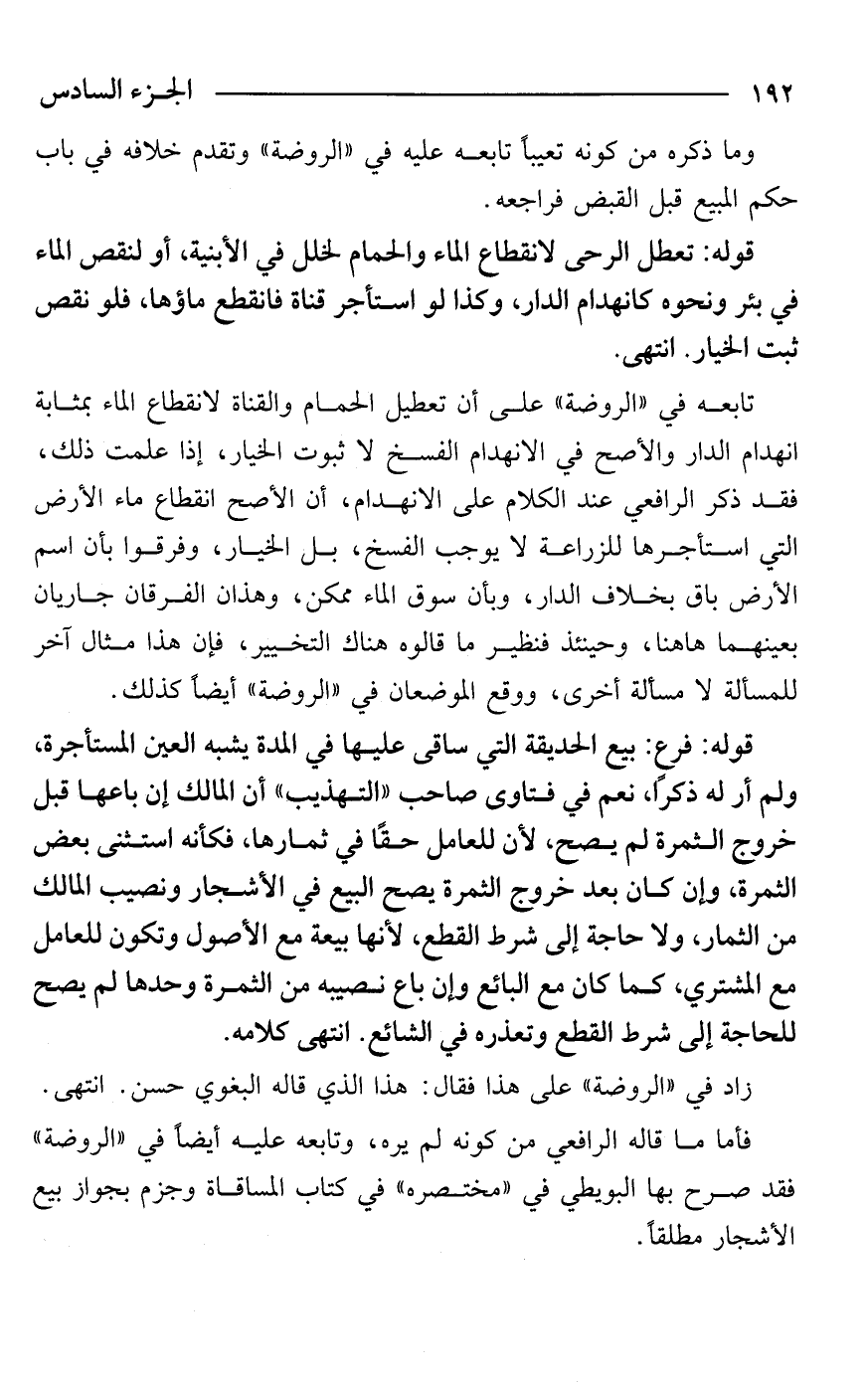 تابعه في "الروضة" على أن تعطيل الحمام والقناة لانقطاع الماء بمثابة انهدام الدار والأصح في الانهدام الفسخ لا ثبوت الخيار، إذا علمت ذلك، فقد ذكر الرافعي عند الكلام على الانهدام، أن الأصح انقطاع ماء الأرض التي استأجرها للزراعة لا يوجب الفسخ، بل الخيار، وفرقوا بأن اسم الأرض باق بخلاف الدار، وبأن سوق الماء ممكن، وهذان الفرقان جاريان بعينهما هاهنا، وحينئذ فنظير ما قالوه هناك التخيير، فإن هذا مثال آخر للمسألة لا مسألة أخرى، ووقع الموضعان في "الروضة" أيضًا كذلك.