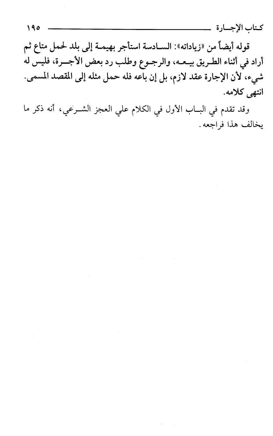 قوله أيضًا من "زياداته": السادسة استأجر بهيمة إلى بلد لحمل متاع ثم أراد في أثناء الطريق بيعه، والرجوع وطلب رد بعض الأجرة، فليس له شيء، لأن الإجارة عقد لازم، بل إن باعه فله حمل مثله إلى المقصد المسمى. انتهى كلامه.