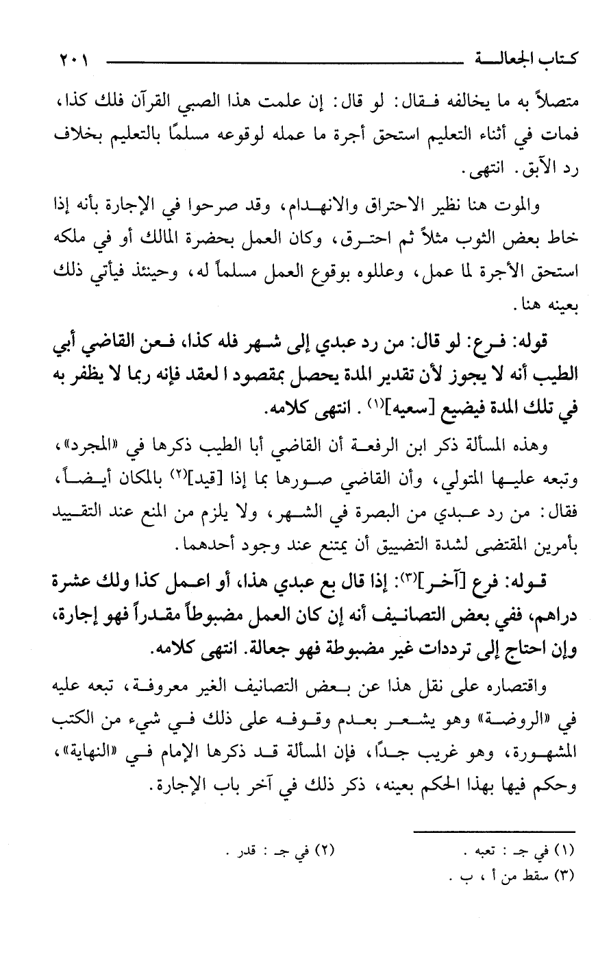 قوله: فرع: لو قال: من رد عبدي إلى شهر فله كذا، فعن القاضي أبي الطيب أنه لا يجوز لأن تقدير المدة يحصل بمقصود العقد فإنه ربما لا يظفر به في تلك المدة فيضيع [سعيه] (¬1). انتهى كلامه.