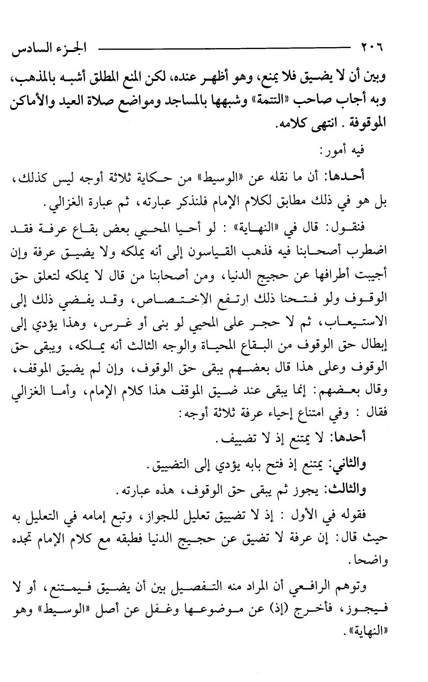فنقول: قال في "النهاية": لو أحيا المحيي بعض بقاع عرفة فقد اضطرب أصحابنا فيه فذهب القياسون إلى أنه يملكه ولا يضيق عرفة وإن أجيبت أطرافها عن حجيج الدنيا، ومن أصحابنا من قال لا يملكه لتعلق حق الوقوف ولو فتحنا ذلك ارتفع الاختصاص، وقد يفضي ذلك إلى الاستيعاب، ثم لا حجر على المحيي لو بنى أو غرس، وهذا يؤدي إلى إبطال حق الوقوف من البقاع المحياة والوجه الثالث أنه يملكه، ويبقى حق الوقوف وعلى هذا قال بعضهم يبقى حق الوقوف، وإن لم يضيق الموقف، وقال بعضهم: إنما يبقى عند ضيق الموقف هذا كلام الإمام، وأما الغزالي فقال: وفي امتناع إحياء عرفة ثلاثة أوجه: