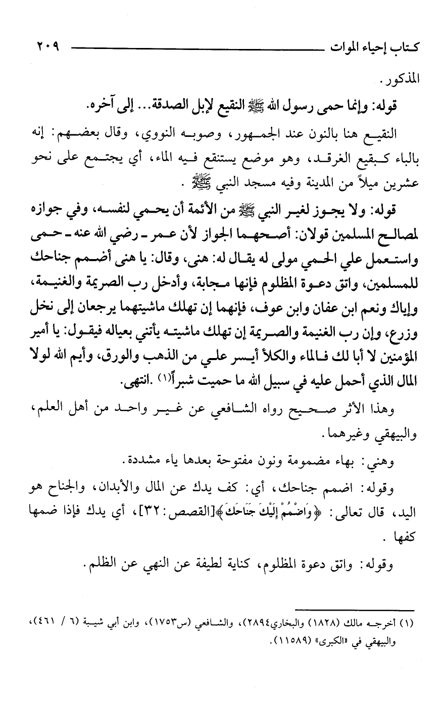 قوله: ولا يجوز لغير النبي - صَلَّى اللَّهُ عَلَيْهِ وَسَلَّمَ - من الأئمة أن يحمي لنفسه، وفي جوازه لمصالح المسلمين قولان: أصحهما الجواز لأن عمر - رضي الله عنه - حمى واستعمل علي الحمي مولى له يقال له: هنى، وقال: يا هنى أضمم جناحك للمسلمين، واتق دعوة المظلوم فإنها مجابة، وأدخل رب الصريمة والغنيمة، وإياك ونعم ابن عفان وابن عوف، فإنهما إن تهلك ماشيتهما يرجعان إلى نخل وزرع، وإن رب الغنيمة والصريمة إن تهلك ماشيته يأتني بعياله فيقول: يا أمير المؤمنين لا أبا لك فالماء والكلأ أيسر علي من الذهب والورق، وأيم الله لولا المال الذي أحمل عليه في سبيل الله ما حميت شبرًا (¬1). انتهى.