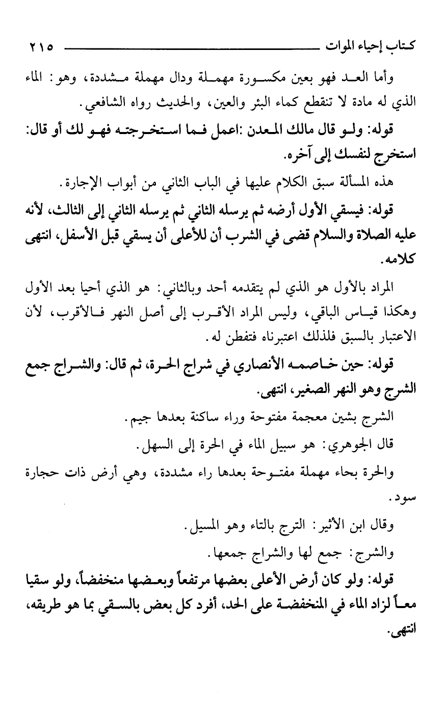 المراد بالأول هو الذي لم يتقدمه أحد وبالثاني: هو الذي أحيا بعد الأول وهكذا قياس الباقي، وليس المراد الأقرب إلى أصل النهر فالأقرب، لأن الاعتبار بالسبق فلذلك اعتبرناه فتفطن له.
