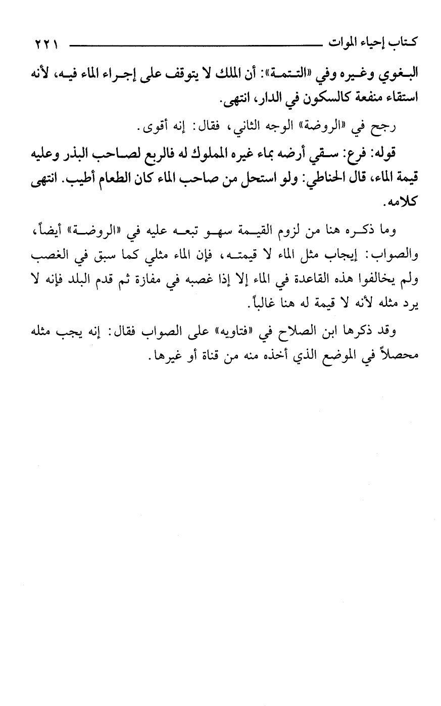 البغوي وغيره وفي "التتمة": أن الملك لا يتوقف على إجراء الماء فيه، لأنه استقاء منفعة كالسكون في الدار، انتهى.