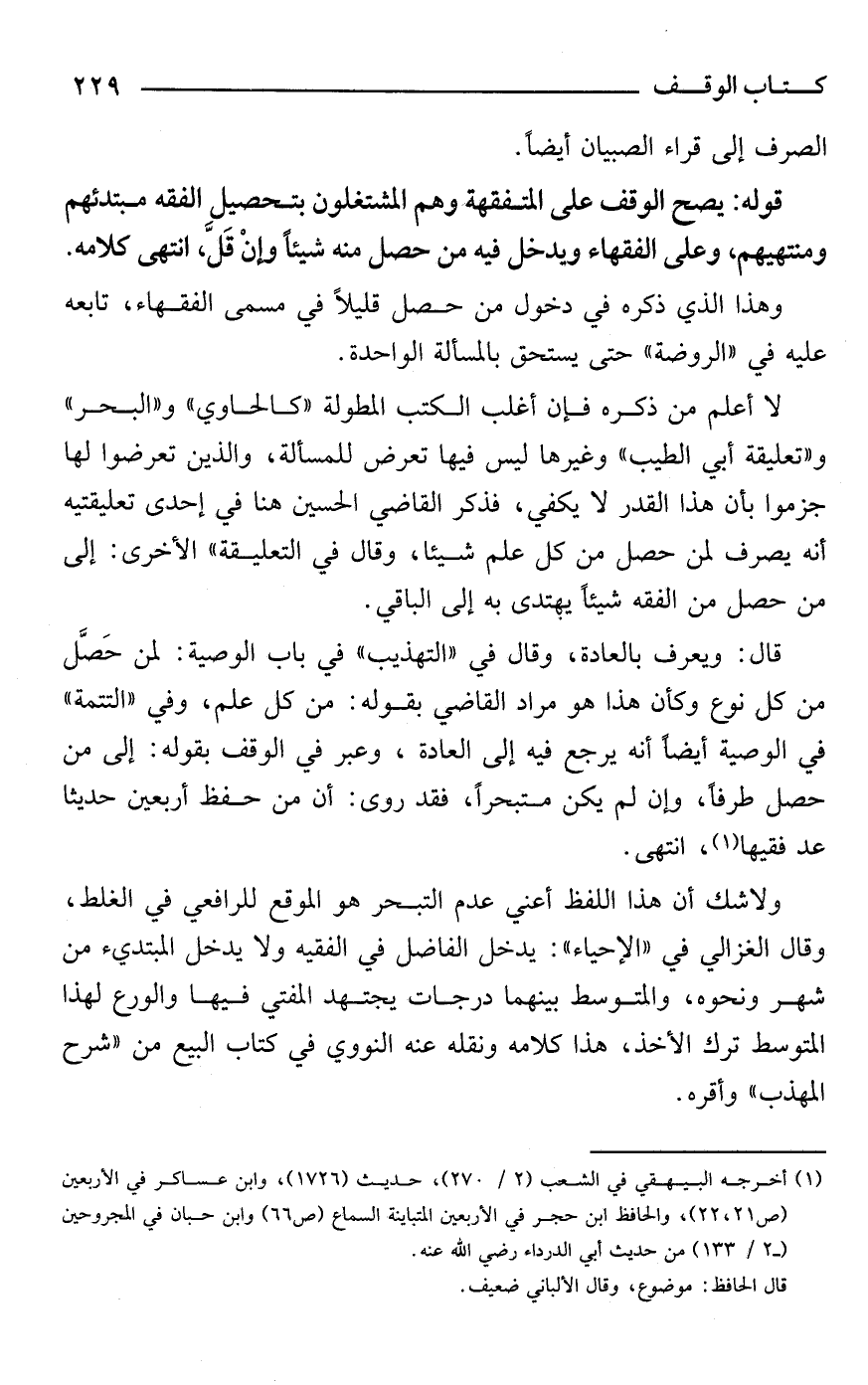 قال: ويعرف بالعادة، وقال في "التهذيب" في باب الوصية: لمن حَصَّل من كل نوع وكأن هذا هو مراد القاضي بقوله: من كل علم، وفي "التتمة" في الوصية أيضًا أنه يرجع فيه إلى العادة، وعبر في الوقف بقوله: إلى من حصل طرفًا، وإن لم يكن متبحرًا، فقد روى: أن من حفظ أربعين حديثا عد فقيها (¬1)، انتهى.