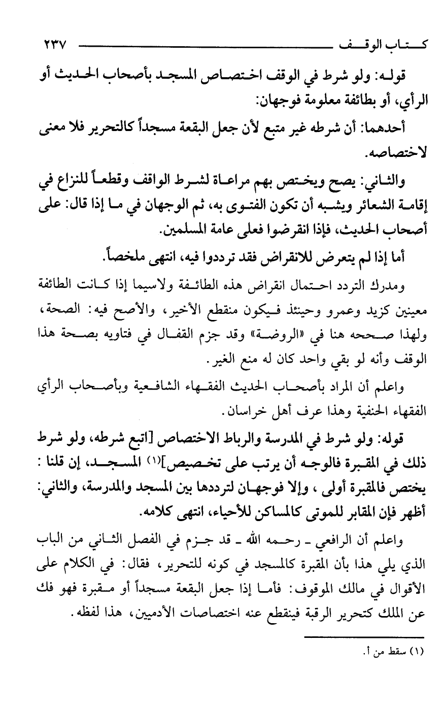 والثاني: يصح ويختص بهم مراعاة لشرط الواقف وقطعًا للنزاع في إقامة الشعائر ويشبه أن تكون الفتوى به، ثم الوجهان في ما إذا قال: على أصحاب الحديث، فإذا انقرضوا فعلى عامة المسلمين.