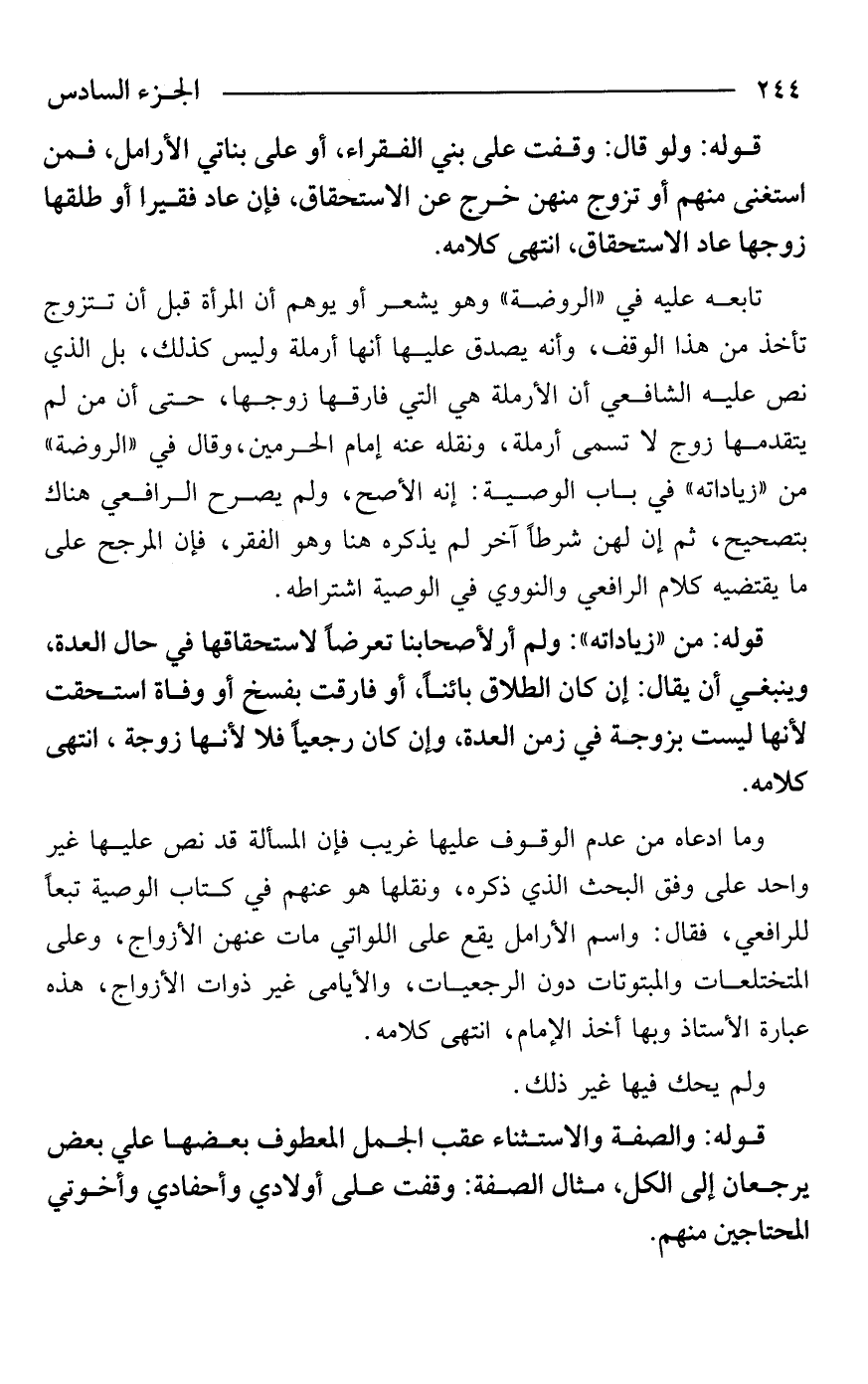 تابعه عليه في "الروضة" وهو يشعر أو يوهم أن المرأة قبل أن تتزوج تأخذ من هذا الوقف، وأنه يصدق عليها أنها أرملة وليس كذلك، بل الذي نص عليه الشافعي أن الأرملة هي التي فارقها زوجها، حتى أن من لم يتقدمها زوج لا تسمى أرملة، ونقله عنه إمام الحرمين، وقال في "الروضة" من "زياداته" في باب الوصية: إنه الأصح، ولم يصرح الرافعي هناك بتصحيح، ثم إن لهن شرطًا آخر لم يذكره هنا وهو الفقر، فإن المرجح على ما يقتضيه كلام الرافعي والنووي في الوصية اشتراطه.