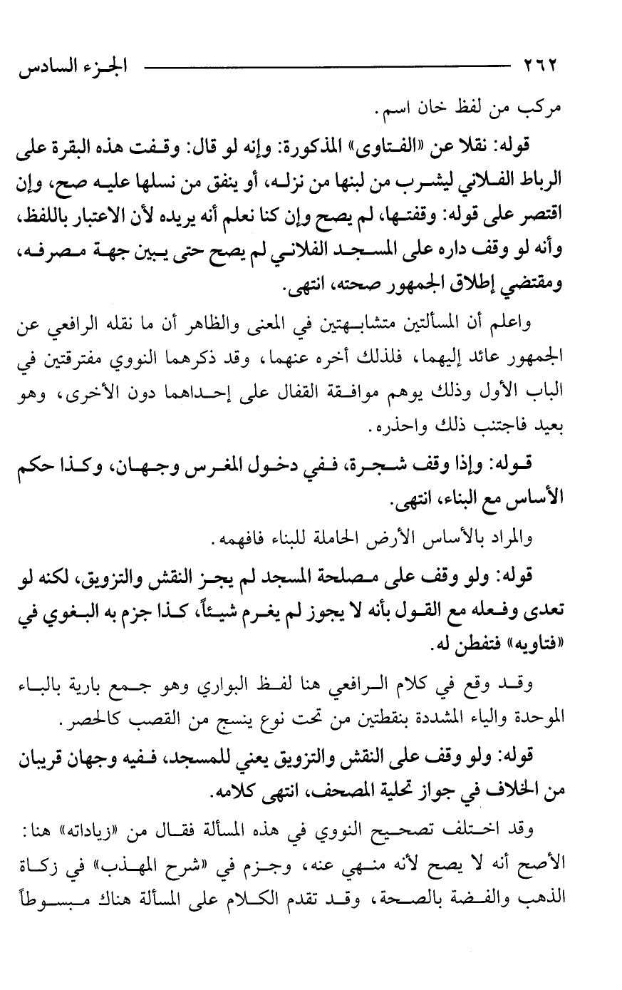 قوله. ولو وقف على مصلحة المسجد لم يجز النقش والتزويق، لكنه لو تعدى وفعله مع القول بأنه لا يجوز لم يغرم شيئًا، كذا جزم به البغوي في "فتاويه" فتفطن له.