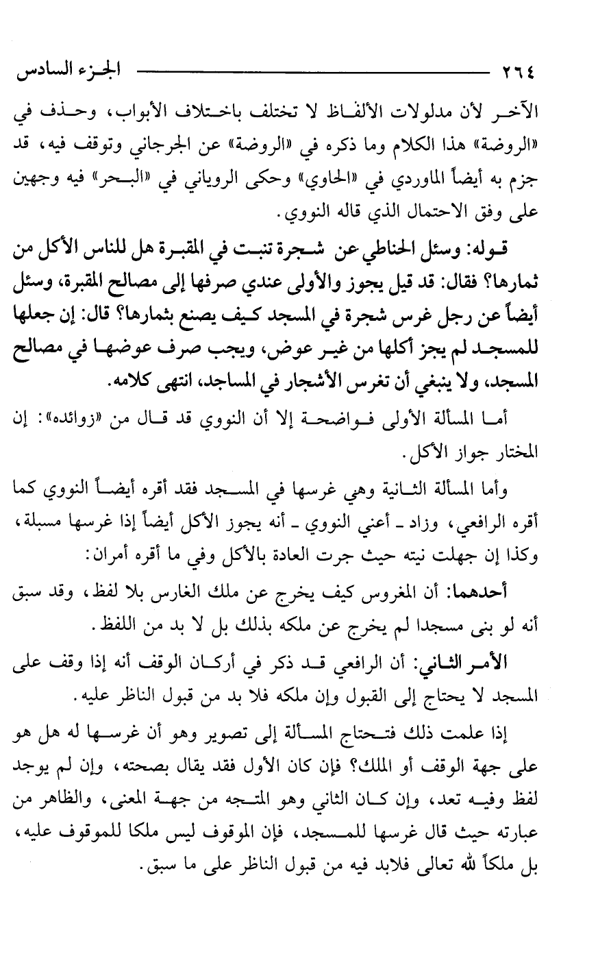 قوله: وسئل الحناطي عن شجرة تنبت في المقبرة هل للناس الأكل من ثمارها؟ فقال: قد قيل يجوز والأولى عندي صرفها إلى مصالح المقبرة، وسئل أيضًا عن رجل غرس شجرة في المسجد كيف يصنع بثمارها؟ قال: إن جعلها للمسجد لم يجز أكلها من غير عوض، ويجب صرف عوضها في مصالح المسجد، ولا ينبغي أن تغرس الأشجار في المساجد، انتهى كلامه.