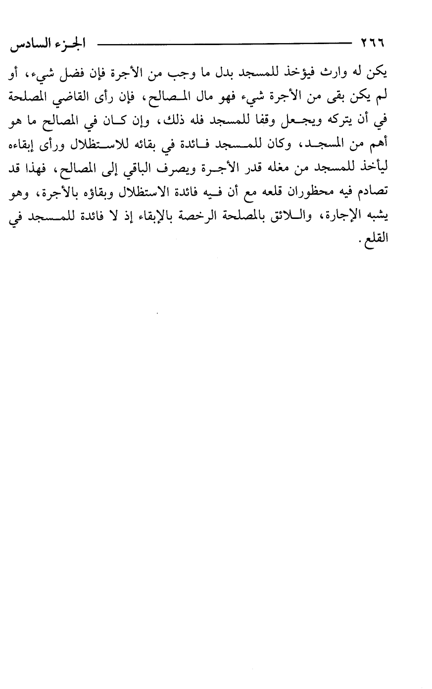 يكن له وارث فيؤخذ للمسجد بدل ما وجب من الأجرة فإن فضل شيء، أو لم يكن بقى من الأجرة شيء فهو مال المصالح، فإن رأى القاضي المصلحة في أن يتركه ويجعل وقفا للمسجد فله ذلك، وإن كان في المصالح ما هو أهم من المسجد، وكان للمسجد فائدة في بقائه للاستظلال ورأى إبقاءه ليأخذ للمسجد من مغله قدر الأجرة ويصرف الباقي إلى المصالح، فهذا قد تصادم فيه محظوران قلعه مع أن فيه فائدة الاستظلال وبقاؤه بالأجرة، وهو يشبه الإجارة، واللائق بالمصلحة الرخصة بالإبقاء إذ لا فائدة للمسجد في القلع.