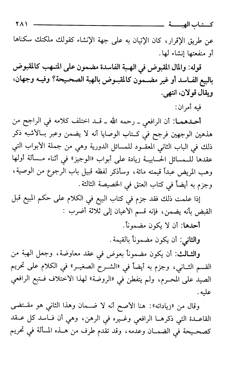 أحدهما: أن الرافعي -رحمه الله- قد اختلف كلامه في الراجح من هذين الوجهين فرجح في كتاب الوصايا أنه لا يضمن وعبر بالأشبه ذكر ذلك في الباب الثاني المعقود للمسائل الدورية وهي من جملة الأبواب التي عقدها للمسائل الحسابية زيادة على أبواب "الوجيز" في أثناء مسألة أولها وهب المريض عبدًا قيمته مائة، وسأذكر لفظه قبيل باب الرجوع من الوصية، وجزم به أيضًا في كتاب العتق في الخصيصة الثالثة.