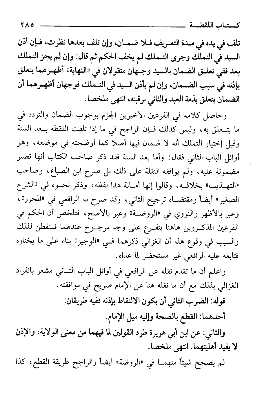 وحاصل كلامه في الفرعين الأخيرين الجزم بوجوب الضمان والتردد في ما يتعلق به، وليس كذلك فإن الراجح في ما إذا تلفت اللقطة بعد السنة وقبل إختيار التملك أنه لا ضمان فيها أصلا كما أوضحته في موضعه، وهو أوائل الباب الثاني فقال: وأما بعد السنة فقد ذكر صاحب الكتاب أنها تصير مضمونة عليه، ولم يوافقه النقلة على ذلك بل صرح ابن الصباغ، وصاحب "التهذيب" بخلافه، وقالوا إنها أمانة هذا لفظه، وذكر نحوه في "الشرح الصغير" أيضًا ومقتضاه ترجيح الثاني، وقد صرح به الرافعي في "المحرر"، وعبر بالأظهر والنووي في "الروضة" وعبر بالأصح، فتلخص أن الحكم في الفرعين المذكورين هاهنا يتفرع على وجه مرجوح عندهما فتفطن لذلك والسبب في وقوع هذا أن الغزالي ذكرهما في "الوجيز" بناء علي ما يختاره فتابعه عليه الرافعي غير مستحضر لما عداه.