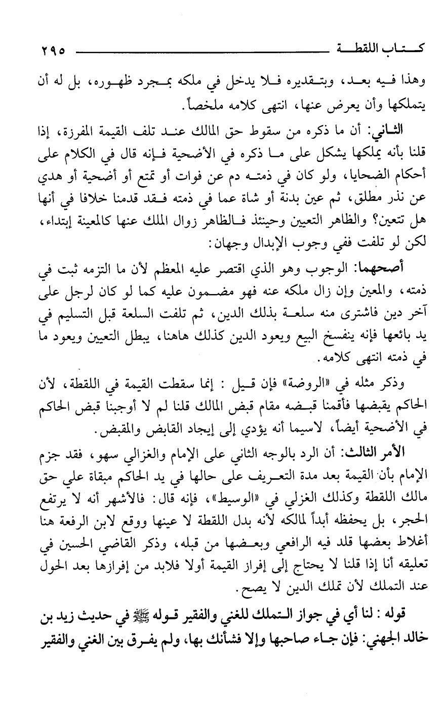 الثاني: أن ما ذكره من سقوط حق المالك عند تلف القيمة المفرزة، إذا قلنا بأنه يملكها يشكل على ما ذكره في الأضحية فإنه قال في الكلام على أحكام الضحايا، ولو كان في ذمته دم عن فوات أو تمتع أو أضحية أو هدي عن نذر مطلق، ثم عين بدنة أو شاة عما في ذمته فقد قدمنا خلافا في أنها هل تتعين؟ والظاهر التعيين وحينئذ فالظاهر زوال الملك عنها كالمعينة إبتداء، لكن لو تلفت ففي وجوب الإبدال وجهان: