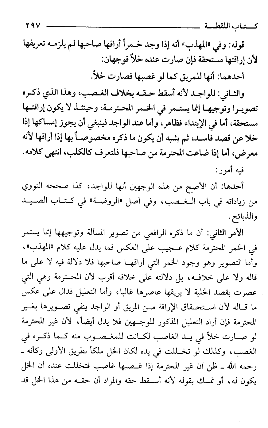 والثاني: للواجد لأنه أسقط حقه بخلاف الغصب، وهذا الذي ذكره تصويرا وتوجيها إنما يستمر في الخمر المحترمة, وحينئذ لا يكون إراقتها مستحقة، أما في الإبتداء فظاهر، وأما عند الواجد فينبغي أن يجوز إمساكها إذا خلا عن قصد فاسد، ثم يشبه أن يكون ما ذكره مخصوصًا بها إذا أراقها لأنه معرض، أما إذا ضاعت المحترمة من صاحبها فلتعرف كالكلب، انتهى كلامه.