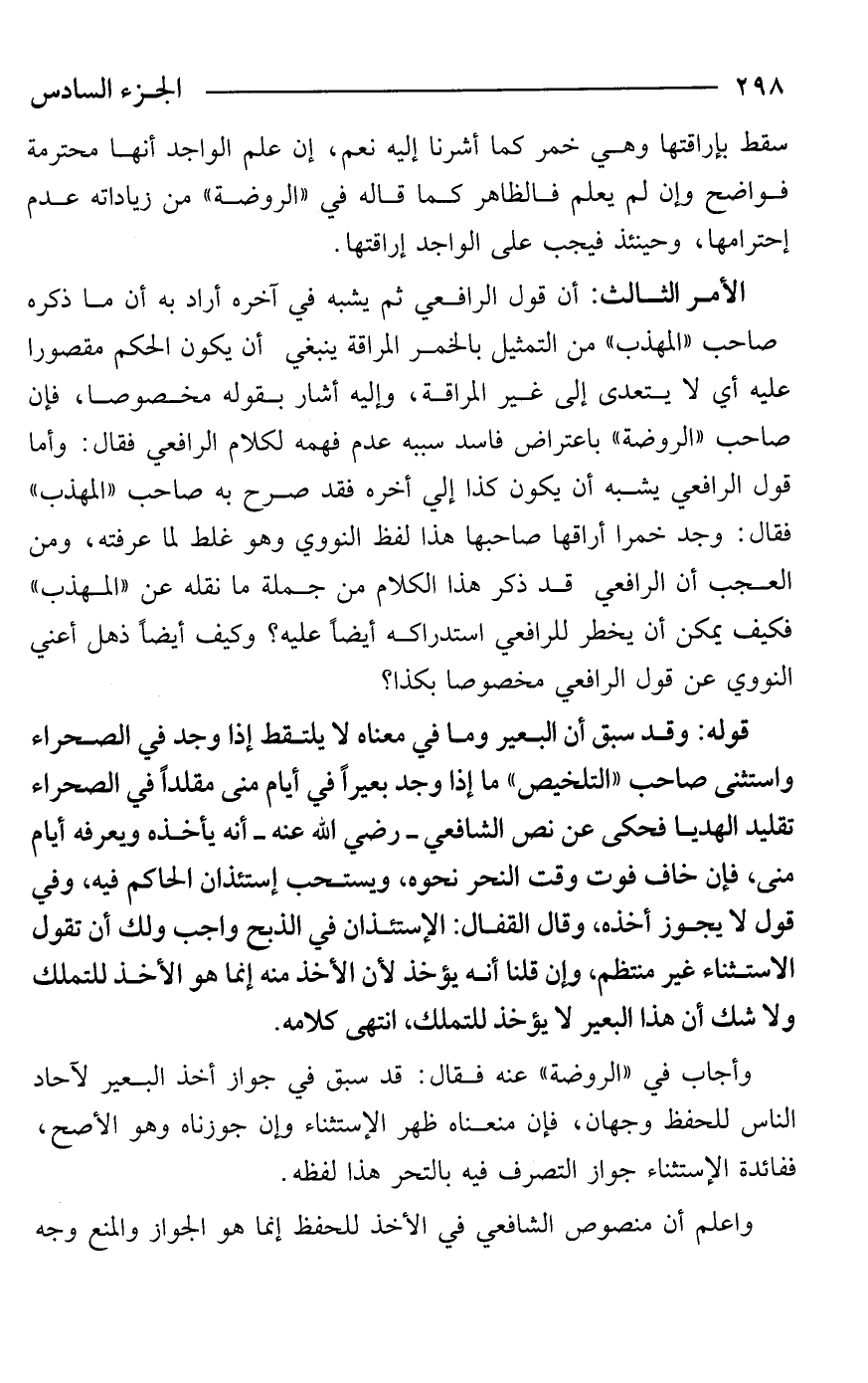 الأمر الثالث: أن قول الرافعي ثم يشبه في آخره أراد به أن ما ذكره صاحب "المهذب" من التمثيل بالخمر المراقة ينبغي أن يكون الحكم مقصورا عليه أي لا يتعدى إلى غير المراقة، وإليه أشار بقوله مخصوصا، فإن صاحب "الروضة" باعتراض فاسد سببه عدم فهمه لكلام الرافعي فقال: وأما قول الرافعي يشبه أن يكون كذا إلي أخره فقد صرح به صاحب "المهذب" فقال: وجد خمرا أراقها صاحبها هذا لفظ النووي وهو غلط لما عرفته، ومن العجب أن الرافعي قد ذكر هذا الكلام من جملة ما نقله عن "المهذب" فكيف يمكن أن يخطر للرافعي استدراكه أيضًا عليه؟ وكيف أيضًا ذهل أعني النووي عن قول الرافعي مخصوصا بكذا؟
