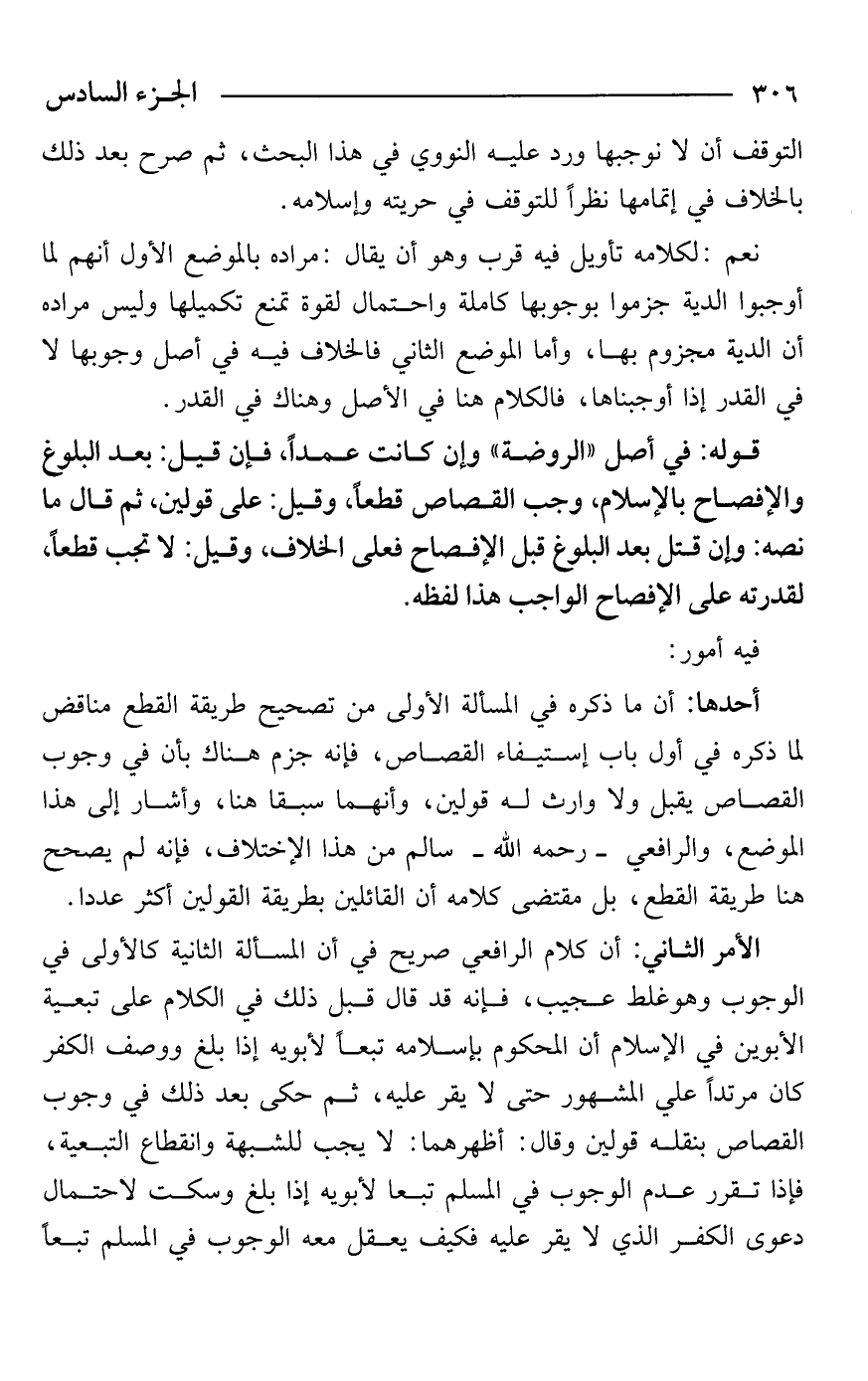 الأمر الثاني: أن كلام الرافعي صريح في أن المسألة الثانية كالأولى في الوجوب وهو غلط عجيب، فإنه قد قال قبل ذلك في الكلام على تبعية الأبوين في الإسلام أن المحكوم بإسلامه تبعًا لأبويه إذا بلغ ووصف الكفر كان مرتدًا علي المشهور حتى لا يقر عليه، ثم حكى بعد ذلك في وجوب القصاص بنقله قولين وقال: أظهرهما: لا يجب للشبهة وانقطاع التبعية، فإذا تقرر عدم الوجوب في المسلم تبعا لأبويه إذا بلغ وسكت لاحتمال دعوى الكفر الذي لا يقر عليه فكيف يعقل معه الوجوب في المسلم تبعًا