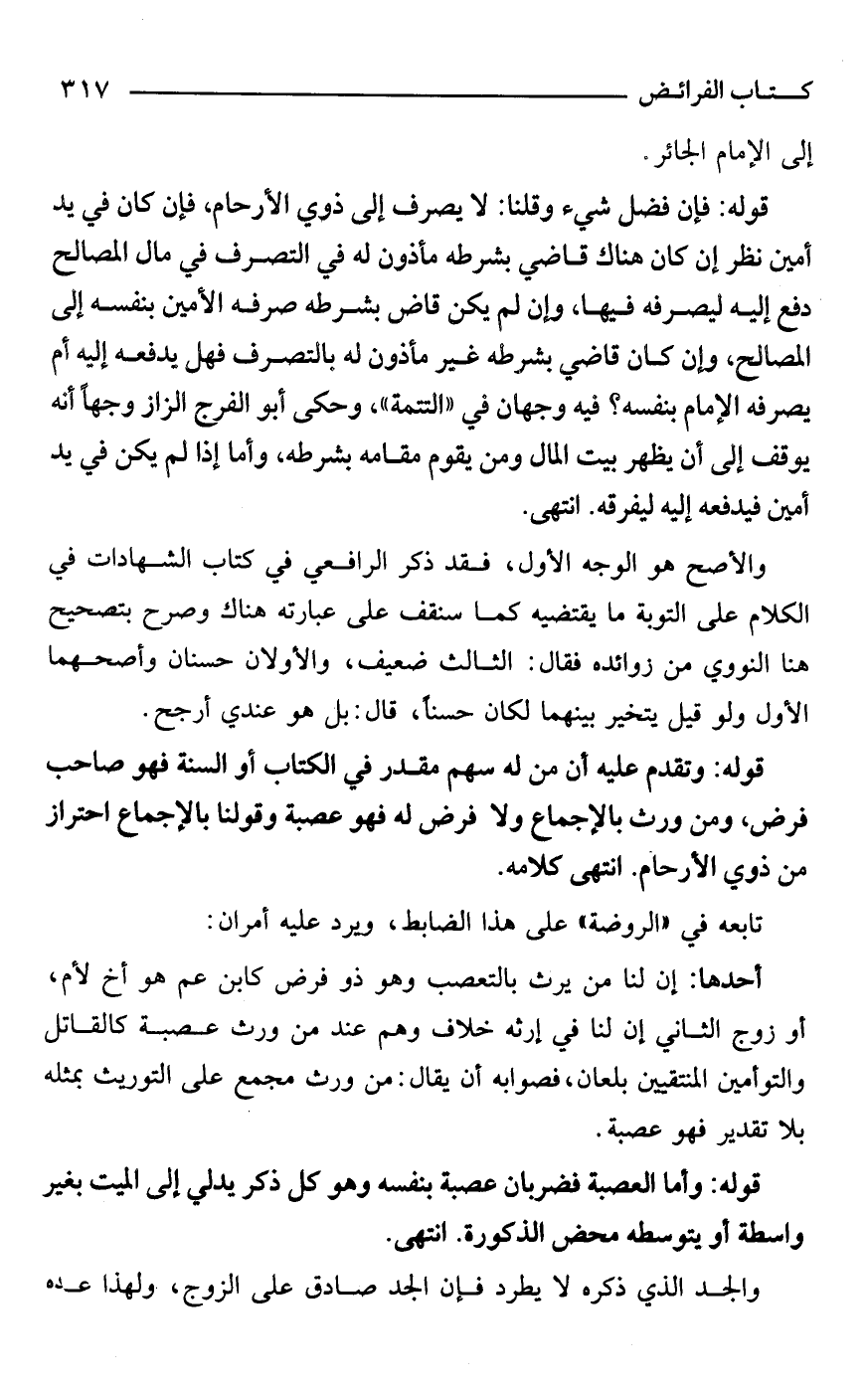 أحدها: إن لنا من يرث بالتعصب وهو ذو فرض كابن عم هو أخ لأم، أو زوج الثاني إن لنا في إرثه خلاف وهم عند من ورث عصبة كالقاتل والتوأمين المنتقيين بلعان، فصوابه أن يقال: من ورث مجمع على التوريث بمثله بلا تقدير فهو عصبة.